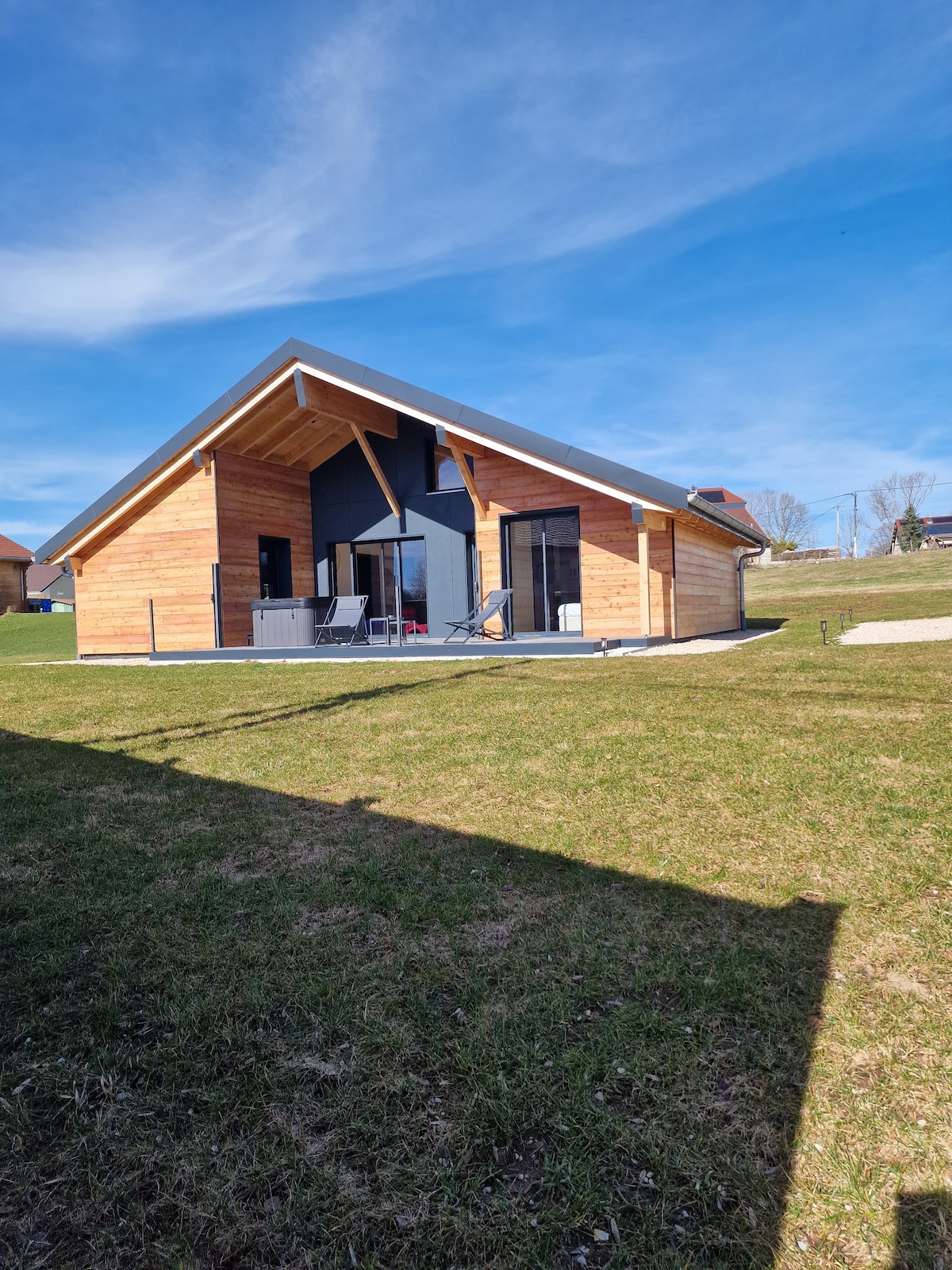 Chalet eco-responsable en ossature bois de 2024 situé à 1035m d'altitude dans le quartier du BAYARD. Surface de 120m2 avec accès à une salle de jeu de 20m2. Salon/séjour/cuisine spacieux et tout équipé 3 chambres double : 2 avec lits 180x200 et 1 avec deux lits 90x200 2 salles de bain avec douche italienne 1 filet dans le vide pour profiter de la vue Terrasse extérieure de 50m2 avec Jacuzzi et bain de soleil en accès libre ; donnant une vue panoramique sur la Forêt du Risoux et le Mont d'Or.