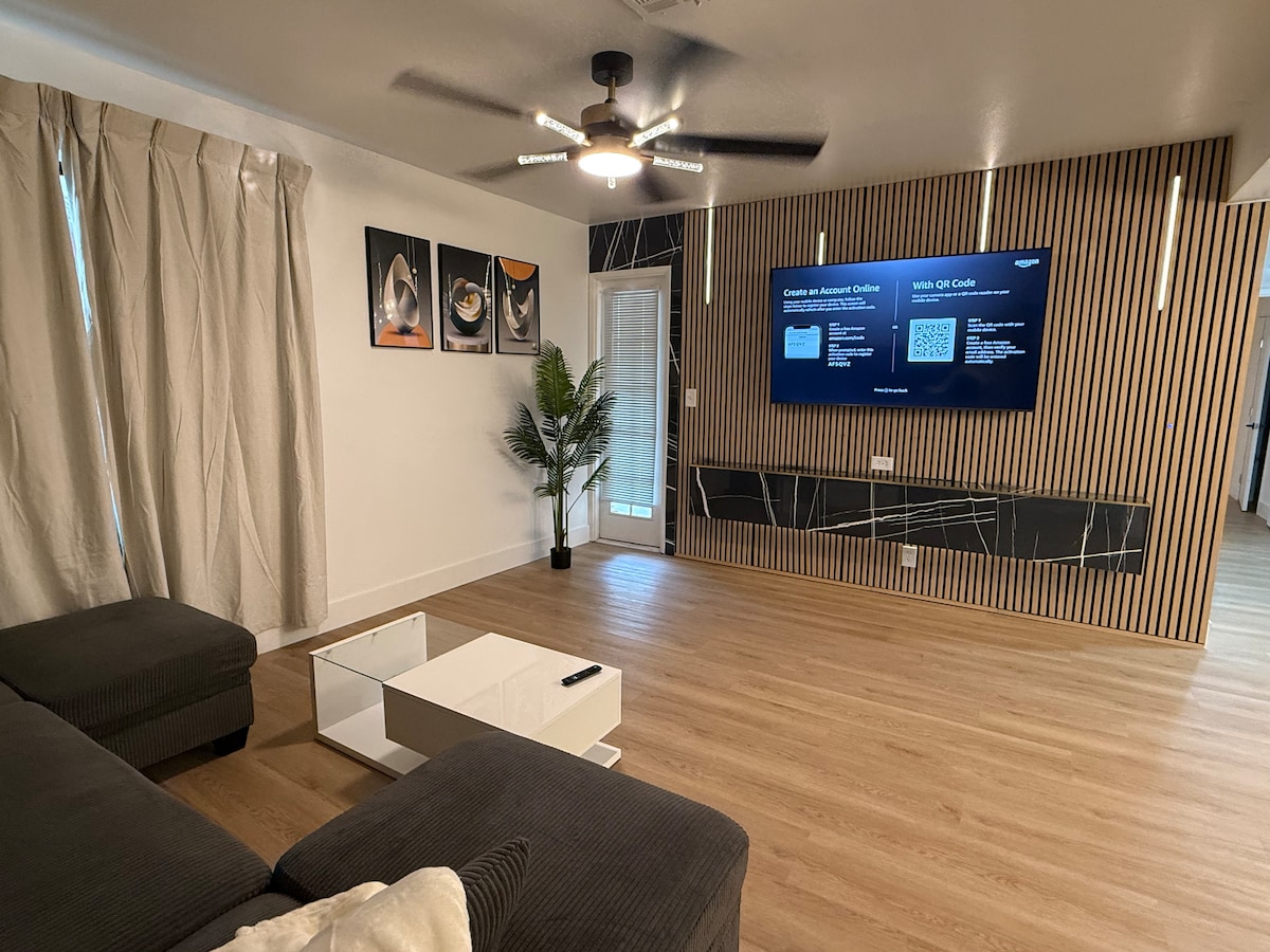 este moderno apartamento es un refugio elegante a solo 5 minutos del Strip de Las Vegas, con supermercados y tiendas cercanos para mayor comodidad. En el interior, disfruta de tres televisores grandes para el entretenimiento y una elegante cocina perfecta para cocinar u hospedar.