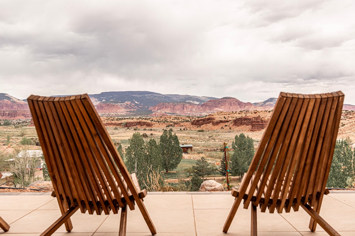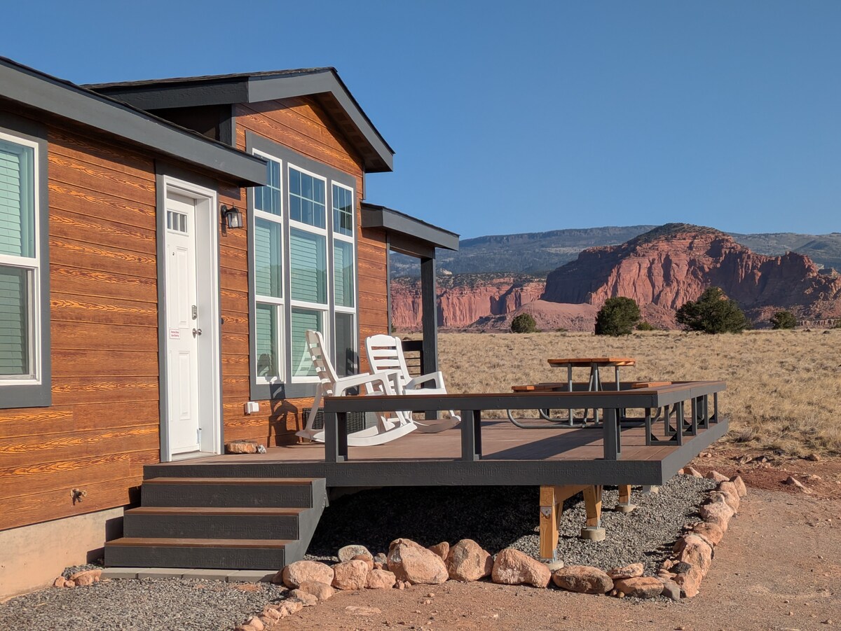 Un refugio para parejas, la Cabaña Canyon Wren está esculpida en la roca entre pinos piñoneros y antiguos matorrales de caoba de montaña. Un pintoresco monolito de arenisca esculpido por la erosión se eleva cuatro pisos al borde del patio, justo más allá de la cabaña. El acceso a la cabaña desde Teasdale Road, está al final de un carril corto que cruza a través de un prado bordeado de bosque con un humedal a un lado y cultivos de alfalfa al otro. El telón de fondo es una hermosa forma rocosa, que incluye una gran roca equilibrada.