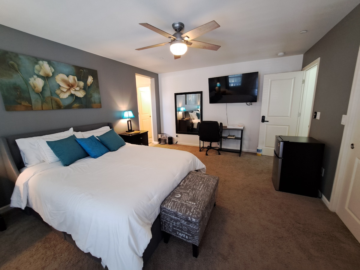 Relajarte en esta acogedora suite principal... Cama tamaño ✔ queen y espacio de trabajo con WiFi de alta velocidad ✔ Mininevera y televisor inteligente de 55 pulgadas ✔ Balcón privado Baño de ✔ hidromasaje y ducha a ras del suelo ✔ Acceso a cocina compartida y lavandería Hay 2 gatos aquí, pero la casa siempre está limpia. Ofrezco comidas caseras por un cargo adicional. Una vez que hayas reservado, podemos hablar más a fondo. (Me iré la semana del 7 al 13 de julio = no cocinaré) Pregunta por el transporte, así como las visitas guiadas a los parques nacionales (Yosemite y Sequoia/Kings Canyon).
