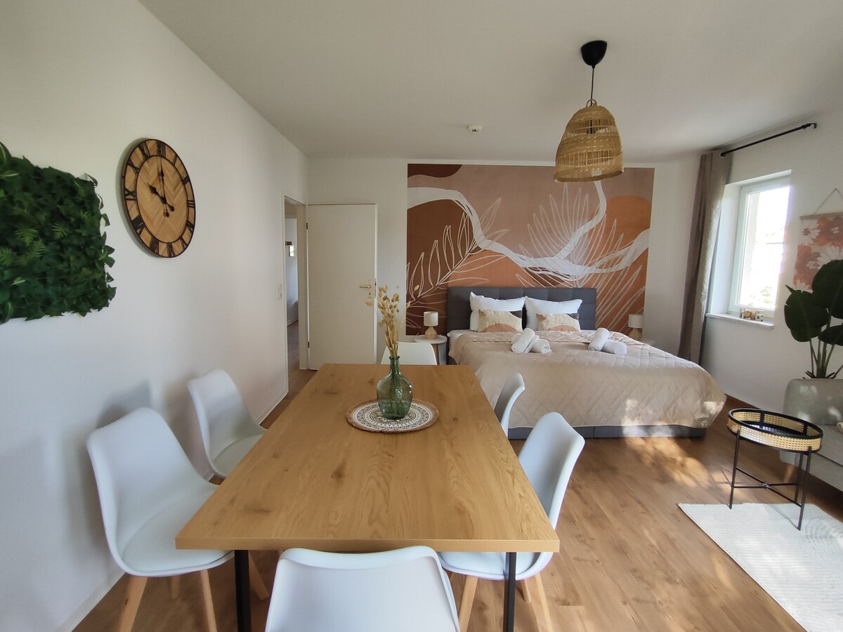 Apartamento amueblado con encanto y entrada independiente en una casa de entramado de madera de 1870, renovada respetando el medio ambiente. Sala de estar y dormitorio combinados (habitación 1) con cama doble, TV, zona de juegos y sofá cama. En la cocina totalmente equipada con una gran mesa de comedor se encuentra el acceso a la terraza. Baño pequeño y elegante con ducha espaciosa y calefacción por suelo radiante. El número de habitaciones depende del número de huéspedes. Apartamento agradablemente fresco en verano.
