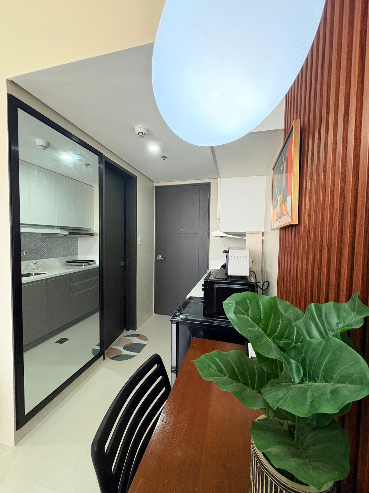 Un estudio luminoso de inspiración mediterránea en Baseline Prestige, en la zona residencial de Cebú, diseñado para disfrutar de la ciudad y de escapadas a la isla. Despiértate con suaves tonos costeros, trabaja en fibra rápida y luego camina a cafés, centros comerciales y hospitales a pocos minutos de distancia. Comodidad de hotel con detalles prácticos: agua potable filtrada, ducha caliente y cocina americana totalmente equipada.