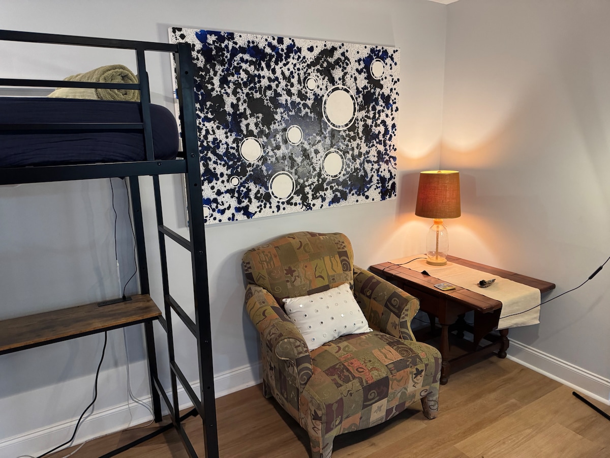 Entrada privada a una amplia suite privada con tonos cálidos. La sala de estar incluye un cómodo sofá y una silla alrededor de la mesa de café. Una mesa de comedor ofrece espacio para juegos y reuniones. La cocina pequeña incluye un fregadero, nevera completa con congelador, microondas y cafetera, estufa, horno tostador, freidora de aire, tostadora, utensilios de cocina y todo lo que necesitarás para preparar comidas. A 3 millas de los torneos de béisbol de East Cobb. Se admiten perros (no cachorros) con cargo adicional por mascotas.
