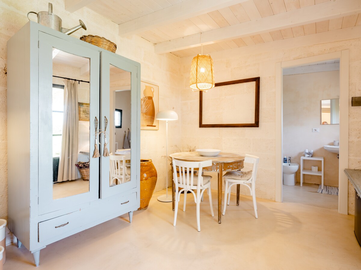 Casa Coratina è un appartamento indipendente dallo stile semplice e accogliente, situato all’interno della nostra tenuta agricola, a pochi minuti dalle spiagge di Gallipoli. Pensato per quattro persone, grazie a un letto matrimoniale al piano inferiore e a un soppalco aperto con due letti singoli. L’appartamento dispone di una cucina attrezzata, un bagno privato con doccia e una zona giorno funzionale, oltre a uno spazio esterno dedicato con tavolo per mangiare all’aperto.