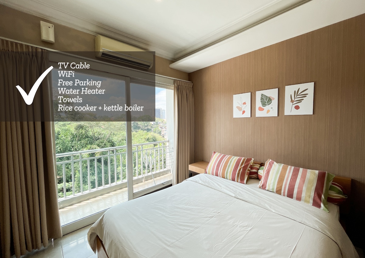 Welcome to our cozy OAOA studio apartment with a balcony to enjoy the city & mountain view! Located in strategic area only 5 mins walk to the famous Dago street, 10 - 15 mins walk to Sabuga jogging track and Bandung Zoo, ca. 35 mins to floating market Lembang by car. We accommodate up to 3 guests. We have a queen size bed 200x160 cm & a sofa bed 180x75cm, a bathroom with shower & water heater, kitchen set, and smart TV. Please read our terms and conditions before making a reservation.