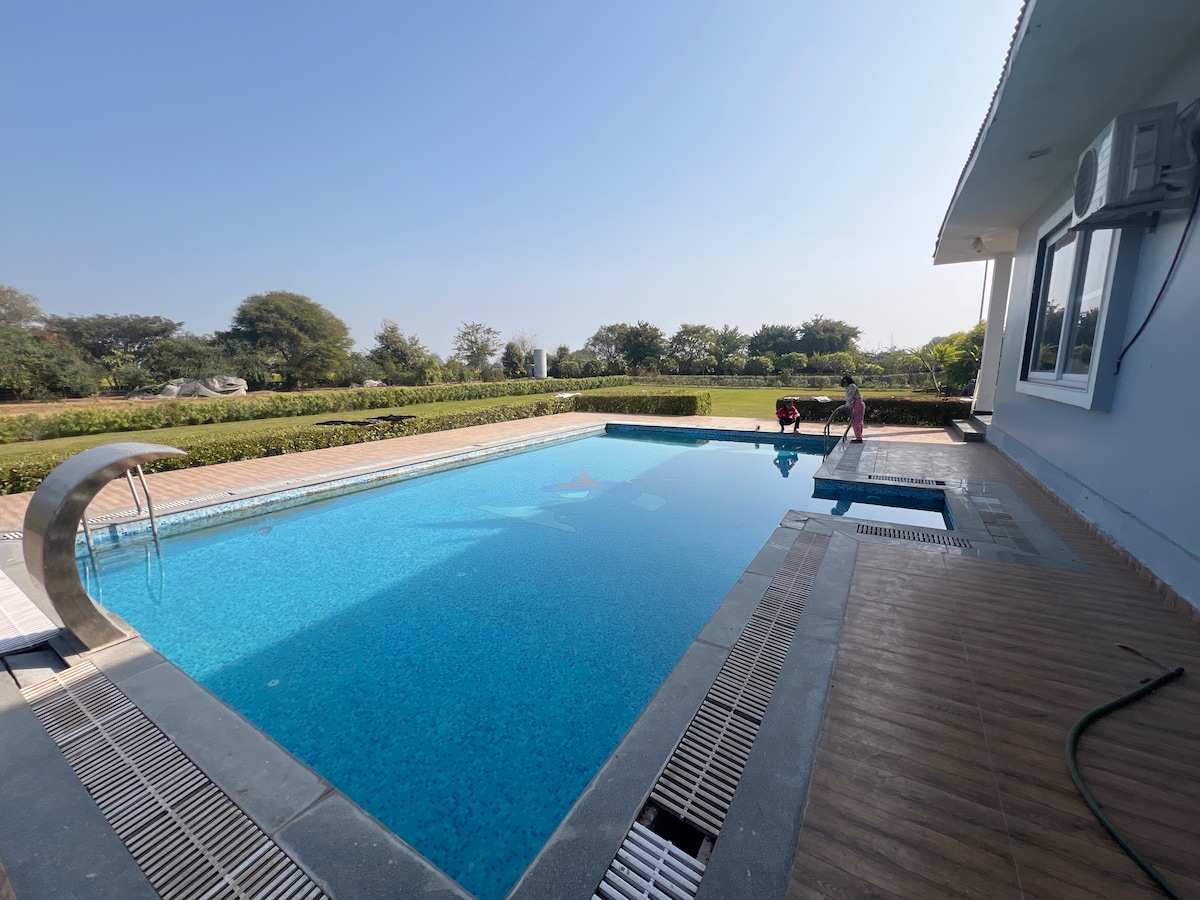 Nestled in the lap of the Aravali's, our peaceful, budget-friendly farmhouse is ideal for families, couples, friends, and pet parents looking for a relaxing nature escape in Alwar (Delhi NCR). With a private swimming pool, open garden spaces, and scenic mountain views, we offer a perfect balance of comfort, privacy, and simplicity. Enjoy slow mornings with chai, let kids & pets play freely in the garden, cool off in the pool during the day, and unwind under open skies—away from city noise.