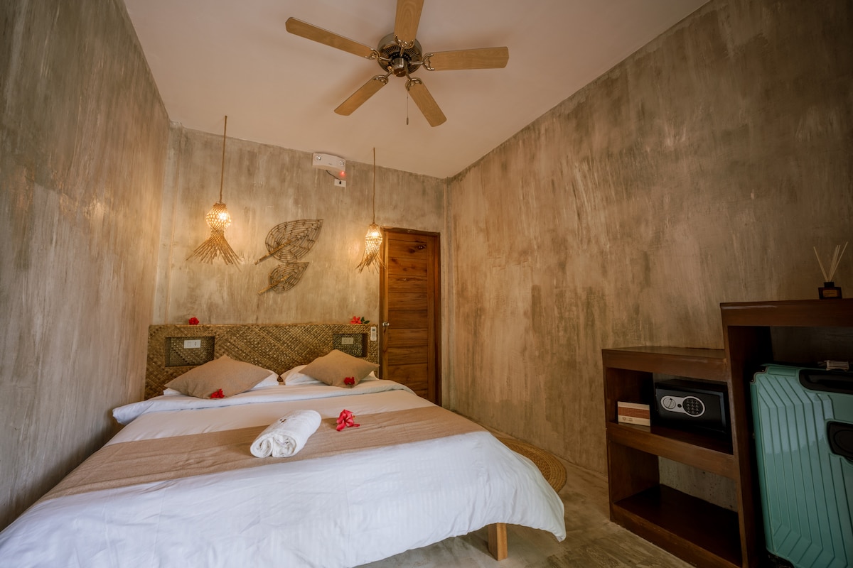 A peaceful room in Catangnan with a queen-size bed, private bathroom with hot shower, private patio or balcony, A/C, ceiling fan, small fridge, safety box, kettle, and hair dryer. Surrounded by greenery, the space offers comfort while keeping you close to Siargao’s top spots. Cloud 9 and General Luna are just a short ride away. Stay connected with Solar power and Starlink Wi-Fi, as well as a generator available during power outages. Your calm and cozy base for exploring Siargao Island.
