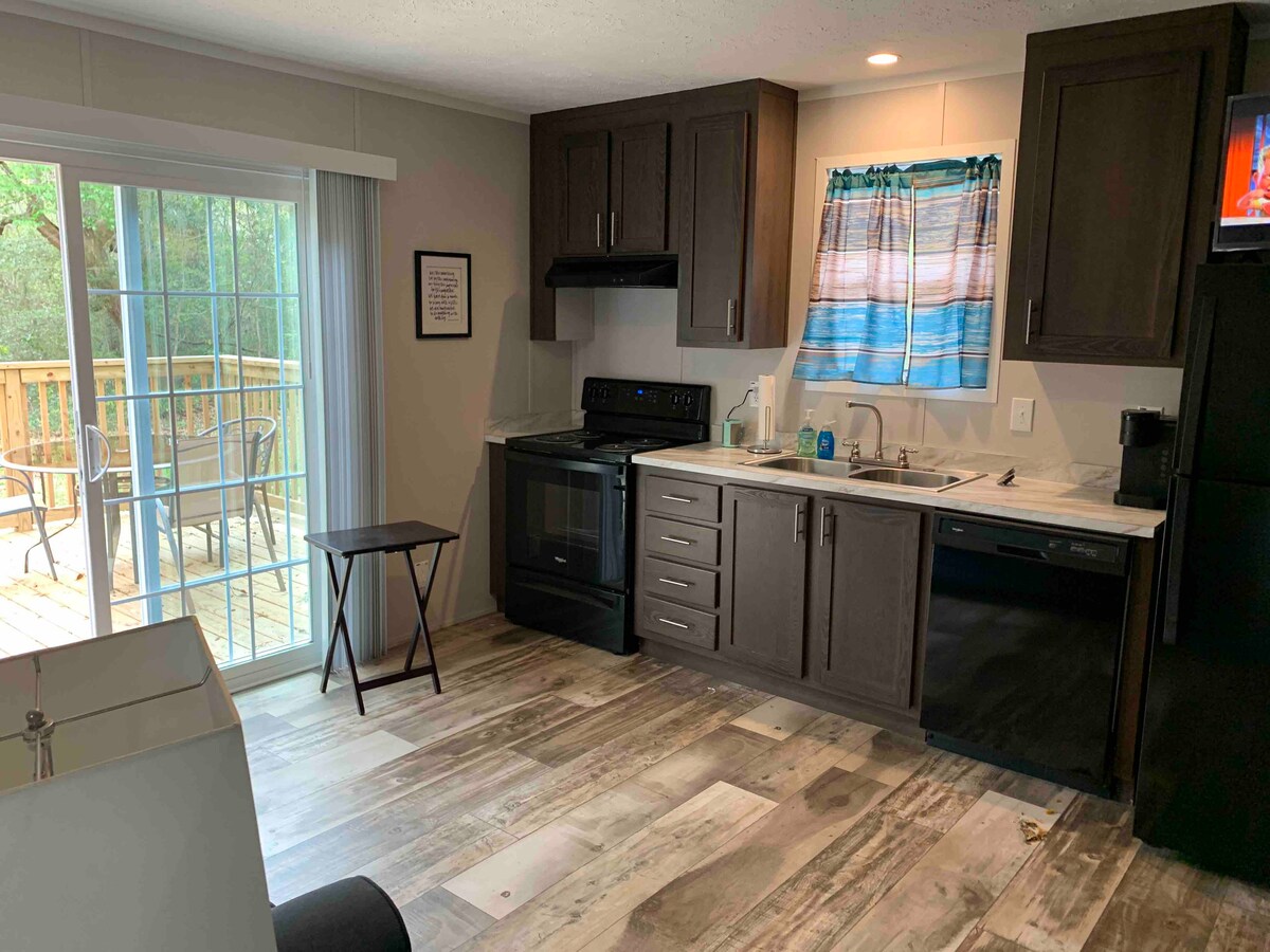 Bunkhouse with large deck under a Live Oak in Murrells Inlet. Small manufactured home with two bedrooms, full bath and furnished kitchen. There is room to bring your pop-up camper or tent and enjoy the large lot with a camp fire pit to create family memories. Wacca Wache Marina on the Intercoastal Waterway is ten minutes away, enjoy the Marshwalk in Murrells Inlet just 3.5 miles away and we are located 15 miles south of Myrtle Beach.