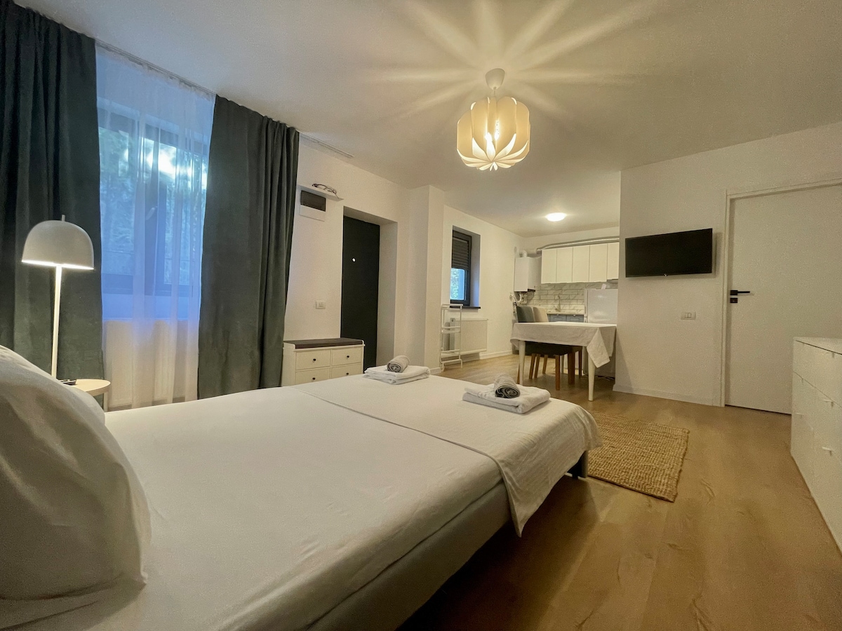 Relájate y desconecta en este alojamiento tranquilo y elegante. Uno de los alojamientos más cercanos al aeropuerto. Cerca de Therme Bucharest. Ubicación tranquila. Probablemente la mejor relación calidad-precio/ubicación/servicios si tienes un vuelo por la mañana, una escala o simplemente buscas alojamiento para unos días para relajarte. La limpieza se realiza después de cada huésped por limpiadores profesionales y todas nuestras sábanas y toallas son lavadas y planchadas por una empresa de lavandería profesional. El estudio totalmente equipado debería proporcionarte la mejor estancia.