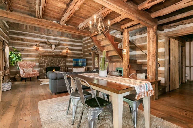 Historic 1880's Log Cabin decorated with period correct antiques. The cabin has wooden floors, exposed beams and natural rock fireplace with ambience insert. 1 bedroom/ 1 bath, (.5 miles) walking distance to our historic Downtown! King Bed in a large open bedroom. Indoor Whirlpool Tub For Two. Kitchenette with Mini Fridge, Microwave and Coffee Maker (No Stove) Television with Complimentary WiFi No Daily Housekeeping Coffee (Keurig) and water provided. No Smoking, Children or Pets Please.