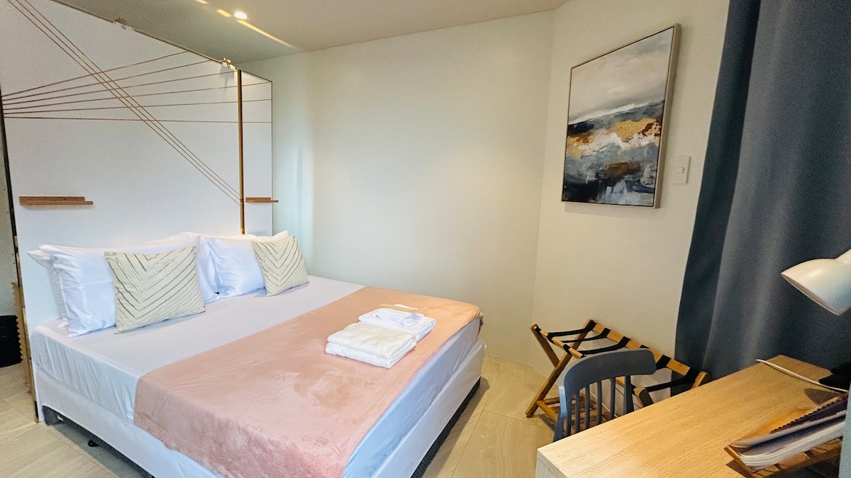 Bienvenido a su relajante refugio en el corazón de Tambuli Seaside Resort, ¡el único complejo residencial en Cebú con acceso directo a la playa! Este elegante estudio es perfecto para parejas, nómadas digitales o viajeros solitarios que buscan comodidad, conveniencia y encanto costero. Disfruta de una cama tamaño queen, cafetera, Netflix, wifi de 300 Mbps, una cocina completa y un balcón tranquilo con vistas al jardín. Tanto si trabajas a distancia como si simplemente quieres desconectar, este acogedor espacio tiene todo lo que necesitas.
