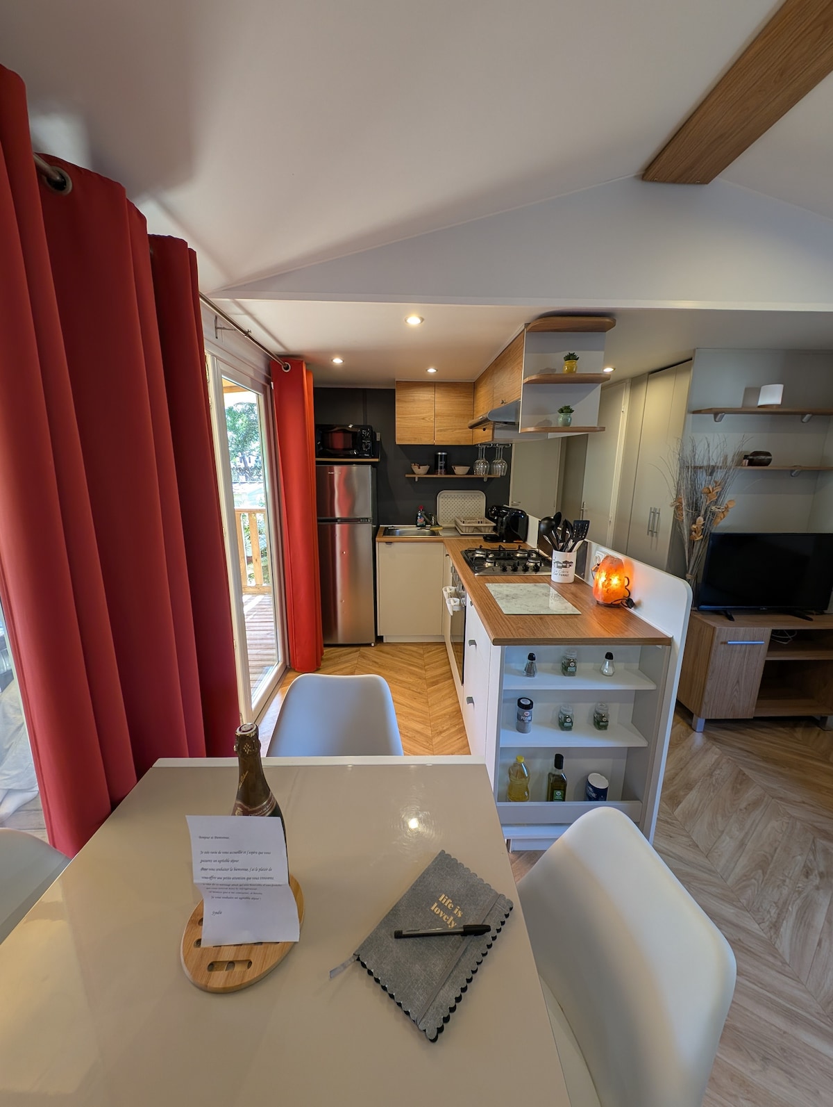 Casa móvil 2024 con aire acondicionado, en el corazón de los pinos, acceso privado a la playa. Equipado: cocina (lavavajillas, nevera-congelador, microondas, Nespresso, hervidor de agua, tostadora), 3 dormitorios, gran terraza cubierta con zona de relajación, comedor y barbacoa. Camping 5★: animaciones, clubes para niños/adolescentes, supermercado, panadería, restaurante, crepería, bares/snacks, parque acuático, tenis, voleibol, petanca, pumptrack, city-stade. No se incluye la ropa de cama/hogar, se puede alquilar en el camping