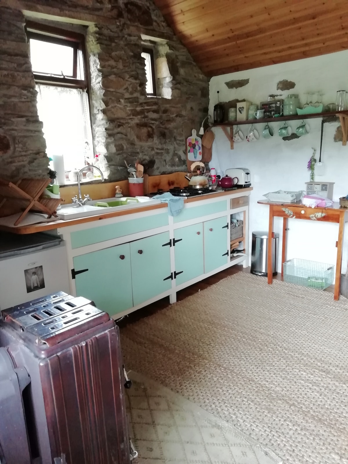 Alojamiento entero. Lugar encantador, luminoso y espacioso con vistas al mar, chimenea y capacidad para 2 personas. Entrada propia a todo el lugar con vistas panorámicas al mar y acceso a la playa desde la propiedad. Cocina totalmente equipada, té y café de cortesía y algunos básicos de cocina: aceite, harina, sal y pimienta. Comedor, sala de estar y dormitorio doble con baño privado. Cuarto de ducha en la planta baja de nuestra tienda de antigüedades, abierta de 1 a 5 durante los meses de verano.