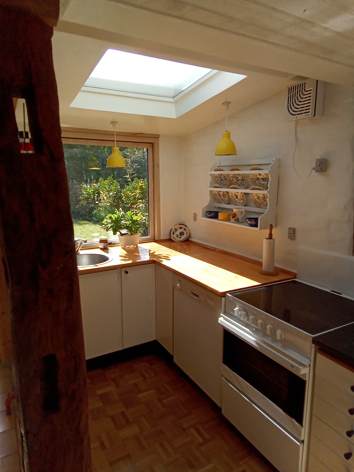Relájate en esta casa única y tranquila con vistas al fiordo de Vejle, campos y bosques. La casa tiene una sala de estar con cocina, comedor y sofá, inodoro con ducha y arriba con dormitorio. Hay dos camas elevadas (cama doble) y una cama individual. Ten en cuenta que las escaleras hasta el primer piso son un poco empinadas y no hay tanto espacio alrededor de la cama doble. En el exterior hay dos terrazas, ambas con vistas. Hay una estufa de leña con leña disponible de forma gratuita. Se incluyen tanto la ropa de cama como las toallas.