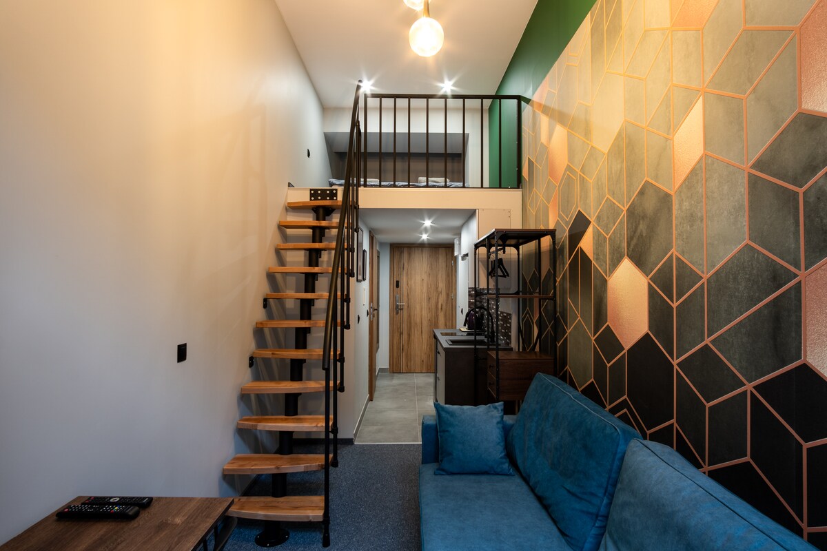Elegante apartamento tipo estudio ideal para alojarse en el corazón de Łódź. A 1 km de la calle Piotrkowska, la famosa calle peatonal de Łódź. Gracias a las cajas fuertes para llaves, el registro de entrada y salida se realiza de forma sencilla, independiente y rápida. Los huéspedes tienen a su disposición un sofá cama y un dormitorio en la entreplanta. El apartamento está situado en el edificio trasero de una casa de vecindad revitalizada de Łódź. Cuenta con una cocina totalmente equipada y todos los productos de limpieza y comodidades necesarios.