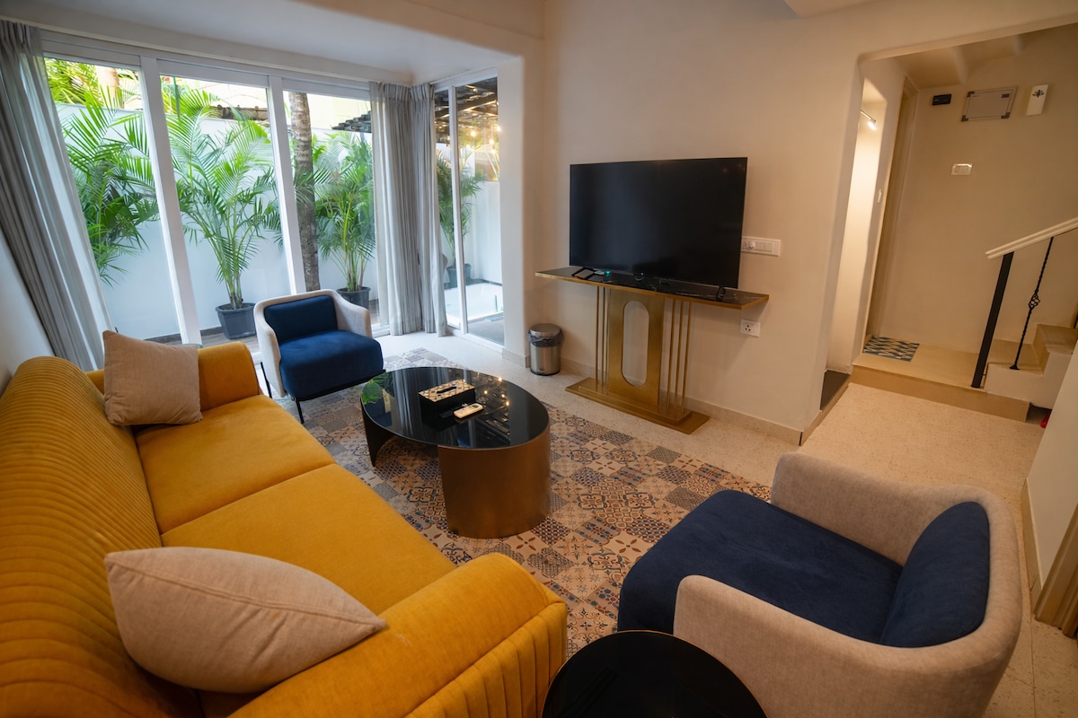 La Open House by BluJam, organizada por @BluJamGetaways, es una villa dúplex tipo estudio en un tranquilo complejo residencial con piscina común Situado en el pintoresco pueblo de Nerul, está a solo 10 minutos en coche (3,5 km) de la playa de Candolim y a 15 minutos a pie de la pintoresca playa de Coco. La encantadora villa tiene un diseño único de estilo abierto en 2 plantas, que ofrece un vestíbulo, cocina, 2 camas dobles en 1 dormitorio, 1 baño en cada planta y un balcón y un pequeño patio trasero que se abre a una serena vista al bosque.