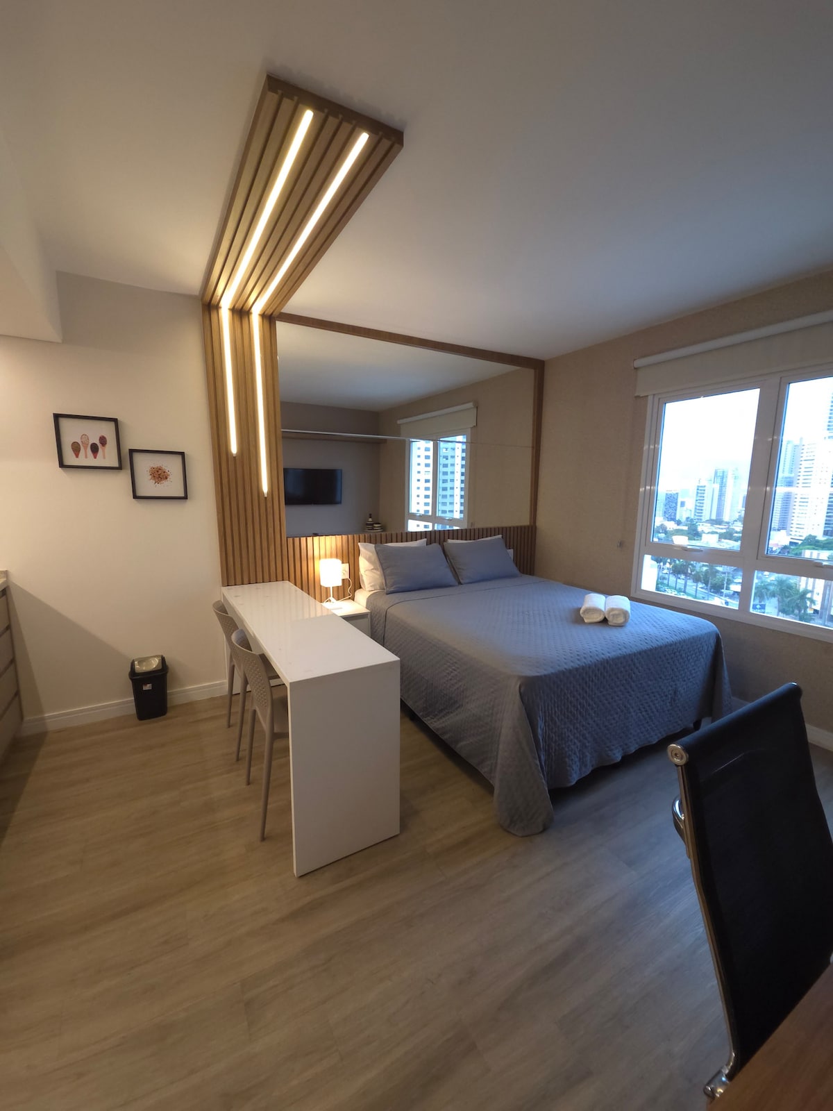Nuevo condominio ❗️Un apartamento único, elegante y sofisticado, hecho para hacerte sentir en casa. Mira tu película favorita en el dormitorio o en la sala de estar con TV giratoria con canales abiertos y aire acondicionado en la habitación. ¡Descansa en una cama tamaño queen y disfruta de la vista desde el amplio balcón del jardín y de una hermosa puesta de sol en el contemporáneo Setor Bueno en la mejor región de Goiânia! Condomínio Tai Residências