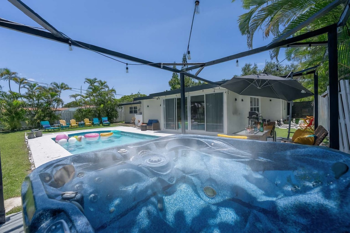 - Piscina CLIMATIZADA GIGANTE con flotadores y comodidades para todos. - JACUZZI perfecto para una noche fría. - BARRIL DE HIELO 400 para recuperarse y refrescarse. - POWER TOWER estación de dominadas y fondos - CAMPO DE GOLF - FOGATA para relajarse - Hamaca. - N64 para 4 jugadores. - Cafetería - Reproductor de discos - Cargador para vehículos eléctricos/Tesla, 48 W - ¡Parrilla de propano y cocina surtida! - ¡A 7 minutos en coche de la playa! - Se adapta fácilmente a 6 adultos y 4 niños. ¡Ahora tienes la oportunidad de reservar la escapada perfecta para cualquier grupo que busque lo mejor de Fort Lauderdale!