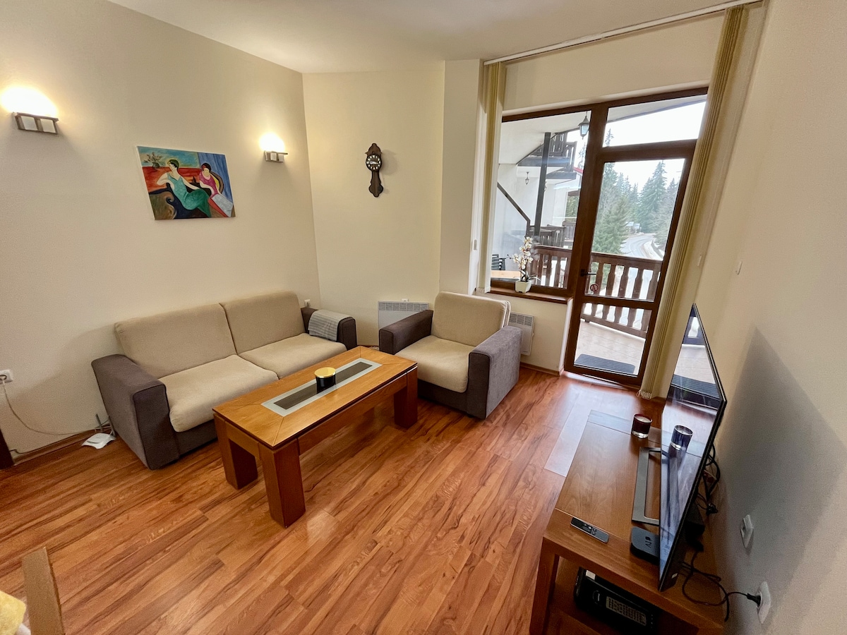 Welcome to our cozy 1-BD flat at Grand Resort Pamporovo, nestled in the picturesque surroundings of Pamporovo. Step inside and be greeted by a warm and inviting living space, thoughtfully furnished to ensure your comfort and relaxation. The bedroom boasts a comfortable bed, guaranteeing a restful night's sleep. In the winter months, indulge in thrilling skiing and snowboarding experiences on the pristine slopes.