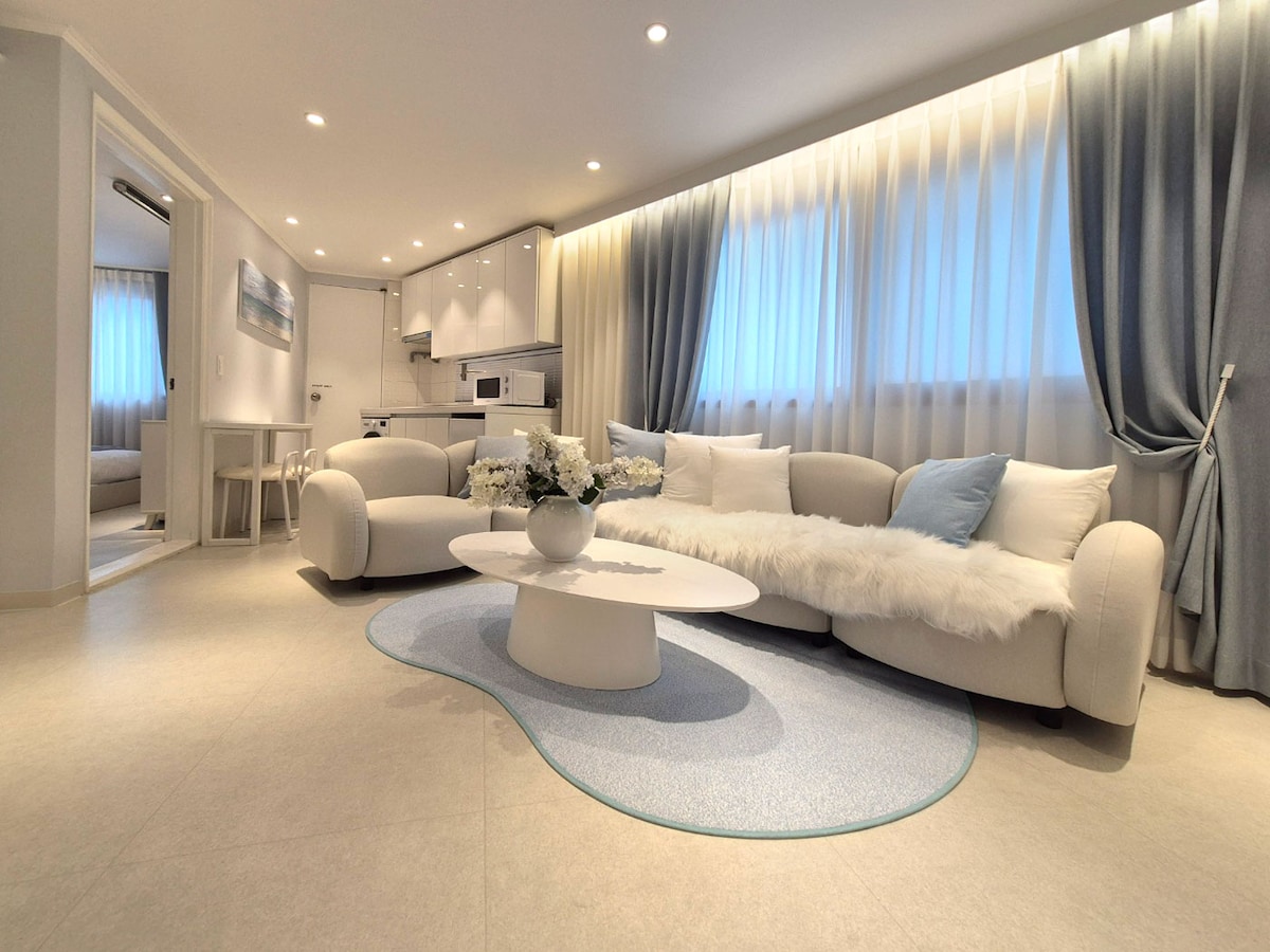Situado entre un apartamento antiguo y un edificio urbano Es un espacio que mi gusto ha impregnado, que diseñé y arreglé yo mismo. Para mí, es un lugar más significativo y cómodo que en cualquier otro lugar. Espero que sea un recuerdo precioso aquí. --- Situado a 5 minutos del alojamiento Western Dome, Lake Park y Madu Station. Mart y las instalaciones de conveniencia están cerca, y el transporte público es conveniente. --- Acceso de huéspedes Puedes disfrutar cómodamente de películas y dramas conectando la televisión QLED 4K de 65 pulgadas, Netflix, Disney y YouTube. (26py) Dormitorio 1- 1 cama tamaño king, 2 dormitorios, 2 camas individuales. La cocina de 3 metros de largo es fácil cocinar y es apta para familias. Tenemos altavoces y estilistas Bluetooth. Los utensilios y granos de café de goteo a mano están disponibles.
