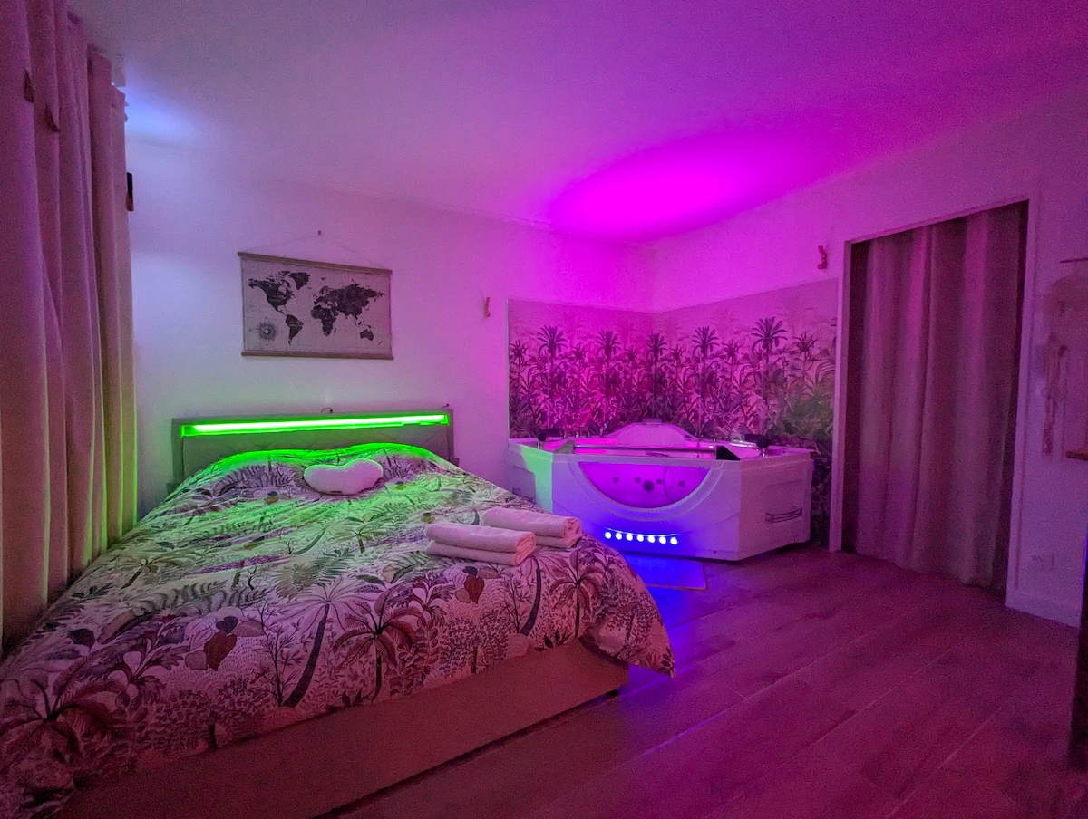 ¡Escápate a tu Love Room exclusiva, un escenario de lujo y pasión! Sumérjase en un mundo de intimidad con jacuzzi, sauna privada y cine de gran confort con sillones de masaje. Disfruta de cenas románticas en la cocina equipada o en el jardín con barbacoa. Aparcamiento privado y seguro en el lugar. A pocos minutos del Stade de France, Roissy-CDG y los parques Disneyland/Astérix. El lugar ideal para momentos inolvidables en pareja.