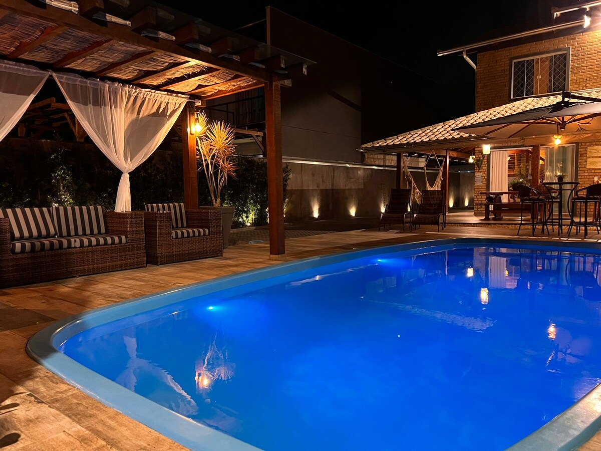 Casa con piscina, zona gourmet con lavabo, barbacoa, smart TV, sonido y cocina completa, 3 suites y 1 habitación más. Sala con TV por suscripción, Netflix, Disney+, Globoplay, HBO max y net 1000gb Wi-Fi en toda la casa e internet por cable en todas las habitaciones y sala de TV, duchas y grifos con calefacción, patio para dos o tres coches, seguridad y mucha comodidad nuestra mayor prioridad.