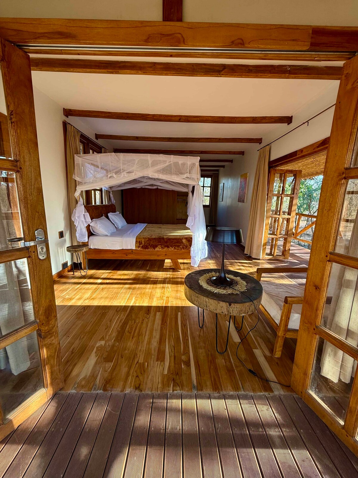 Step into your luxury safari tent, elevated on a wooden deck with a private veranda where impalas, pumbas, and monkeys roam across Mikumi’s sweeping landscapes. Inside, a king-sized bed with mosquito net ensures restful nights, while mesh windows invite the natural breeze and bush sounds. The ensuite bathroom features a rain shower, elegant wooden finishes, and modern comforts. Rustic elegance meets wilderness adventure—with breakfast, lunch, and dinner included.