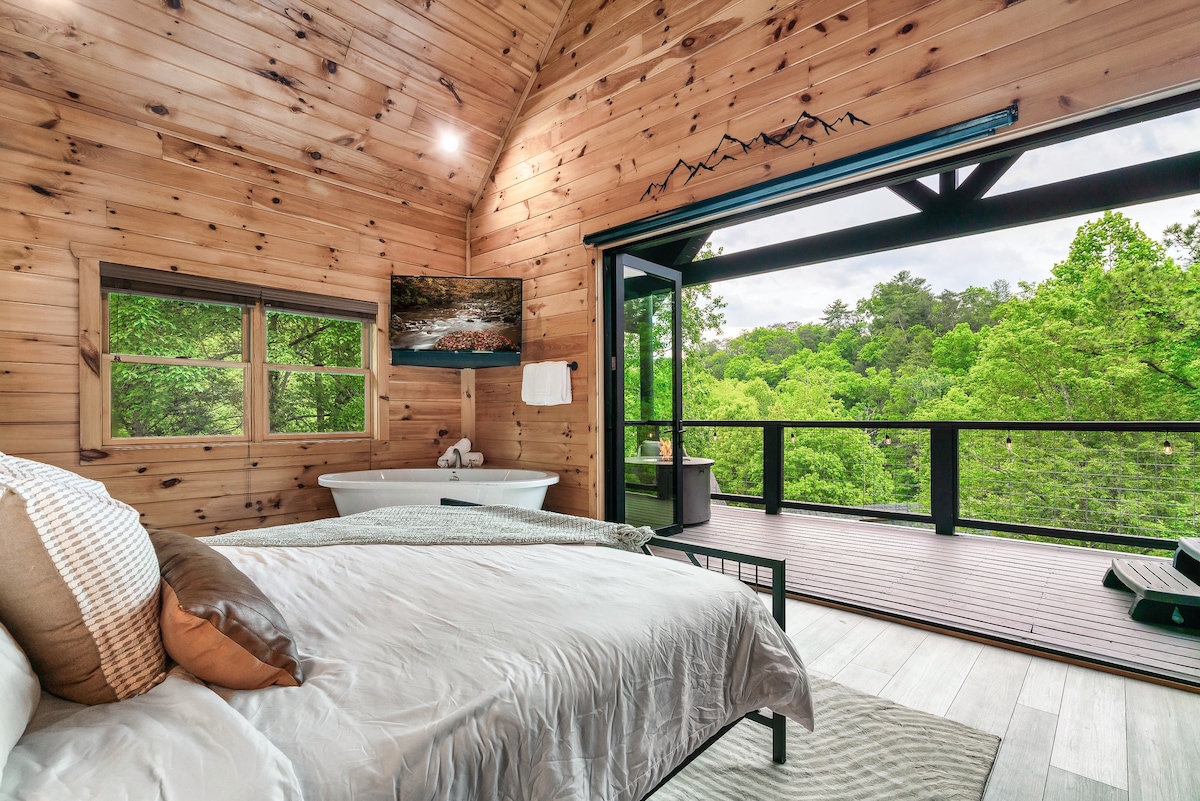 La casa del árbol de Smoky Mountain, vistas, jacuzzi de cedro