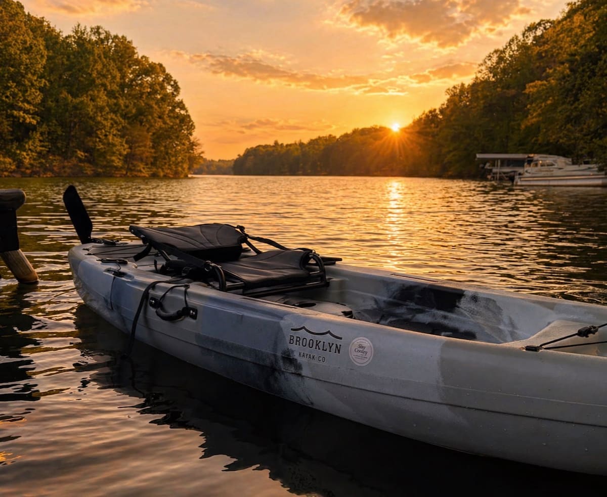 Casa de campo al atardecer frente al agua con kayaks