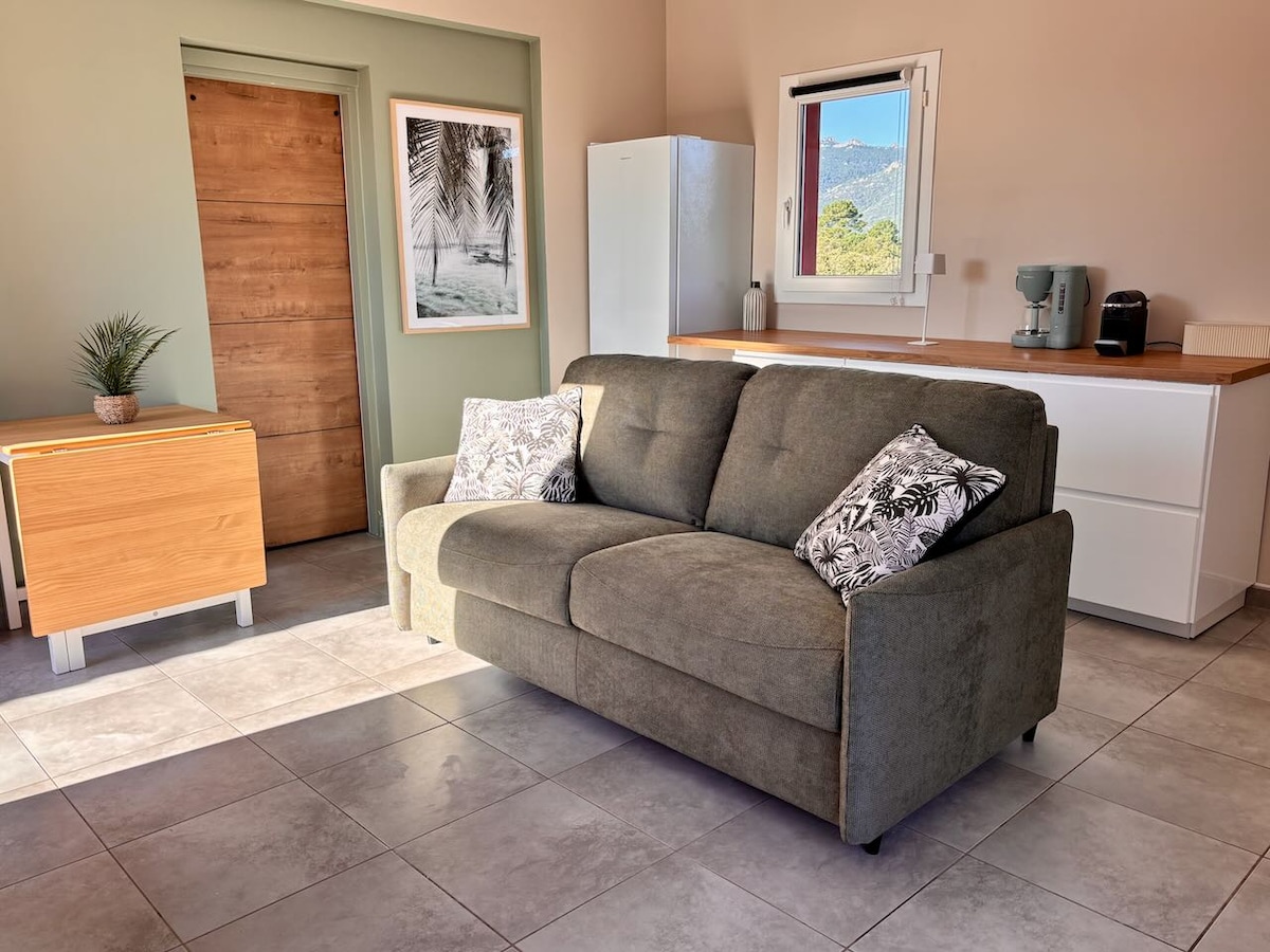 En una zona tranquila, a 10 minutos de Ajaccio, a 15 minutos del aeropuerto, a 10 minutos del puerto y a 10 minutos de las playas, ofrecemos una habitación nueva con capacidad para 2 personas. Esta habitación tiene acceso independiente y un jardín privado reservado para usted donde puede desayunar y descansar... Consta de una zona de noche con una cama doble, escritorio, conectada a wifi y un baño con ducha y aseo. EL DESAYUNO ESTÁ INCLUIDO EN EL PRECIO