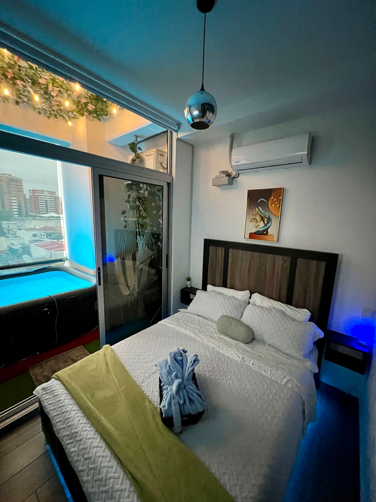 Relájate en este espacio tan tranquilo y elegante. Disfruta de una experiencia con estilo en este alojamiento en la mejor area de la ciudad, a pocos metros del aeropuerto. Con un balcon con jacuzzi y chimenea, nuestra suite de lujo tiene una vista impresionante a la ciudad. Es una muy buena opcion para ti para quedarte, tiene un estilo moderno, area para home office, nunca te aburriras mientras trabajas, conocelo!!