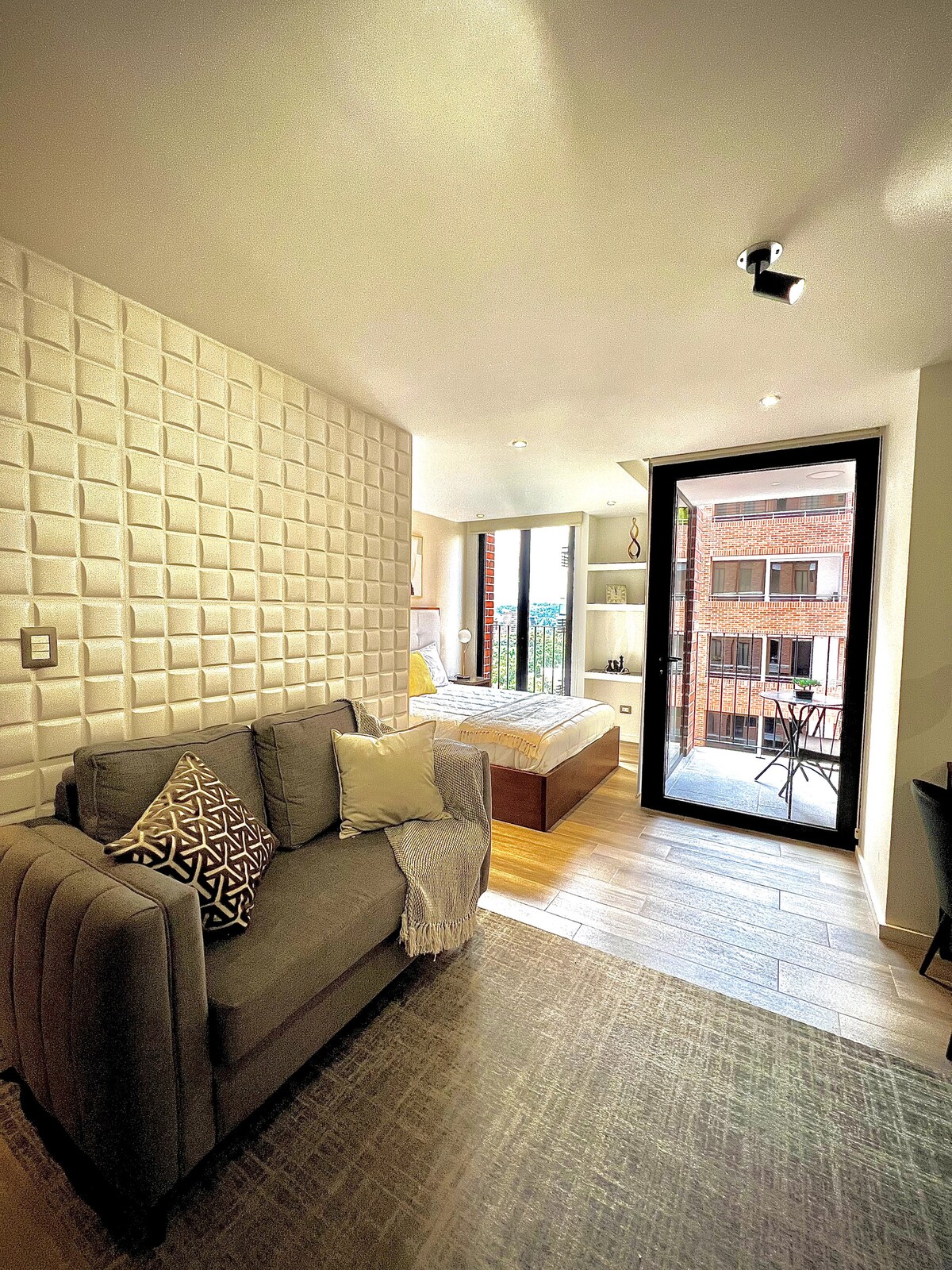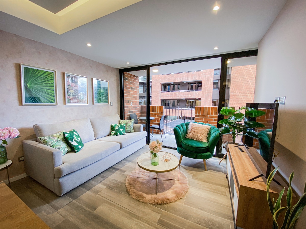 Elegante y moderno apartamento/Suite en una excelente ubicación a centros comerciales, plazas financieras, restaurantes y diversión en la zona viva, puedes movilizarte a pie o en vehículo. Todo lo que desees lo encuentras a pocos minutos de nuestro espacio. Disfruta de una vista espectacular a la diagonal 6, desayunando desde el balcón o bien descansa en una cómoda cama tamaño Queen, ¿ Pendientes ? cuentas con un moderno escritorio de madera con lampara si deseas avanzar.