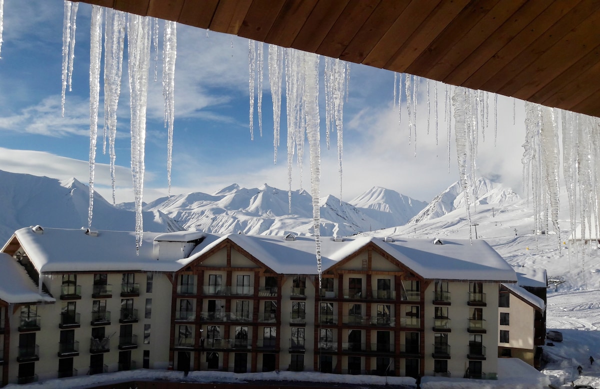 Only one minute walking distance to the main ski lift Gondola .The aparthotel is located in New Gudauri district, Redco Loft 1 . Comes with free locker for ski storage. Spacious and cozy studio with mountain view balcony . Netflix and cable, smart large TV. 37 m2 - Comfortably fits 4 guests. It's fully equipped with all the kitchen amenities for cooking., free Wifi. Supermarket right in the building, all other shops and restaurants, ski rental shops in 1 to 2 minutes walking time.