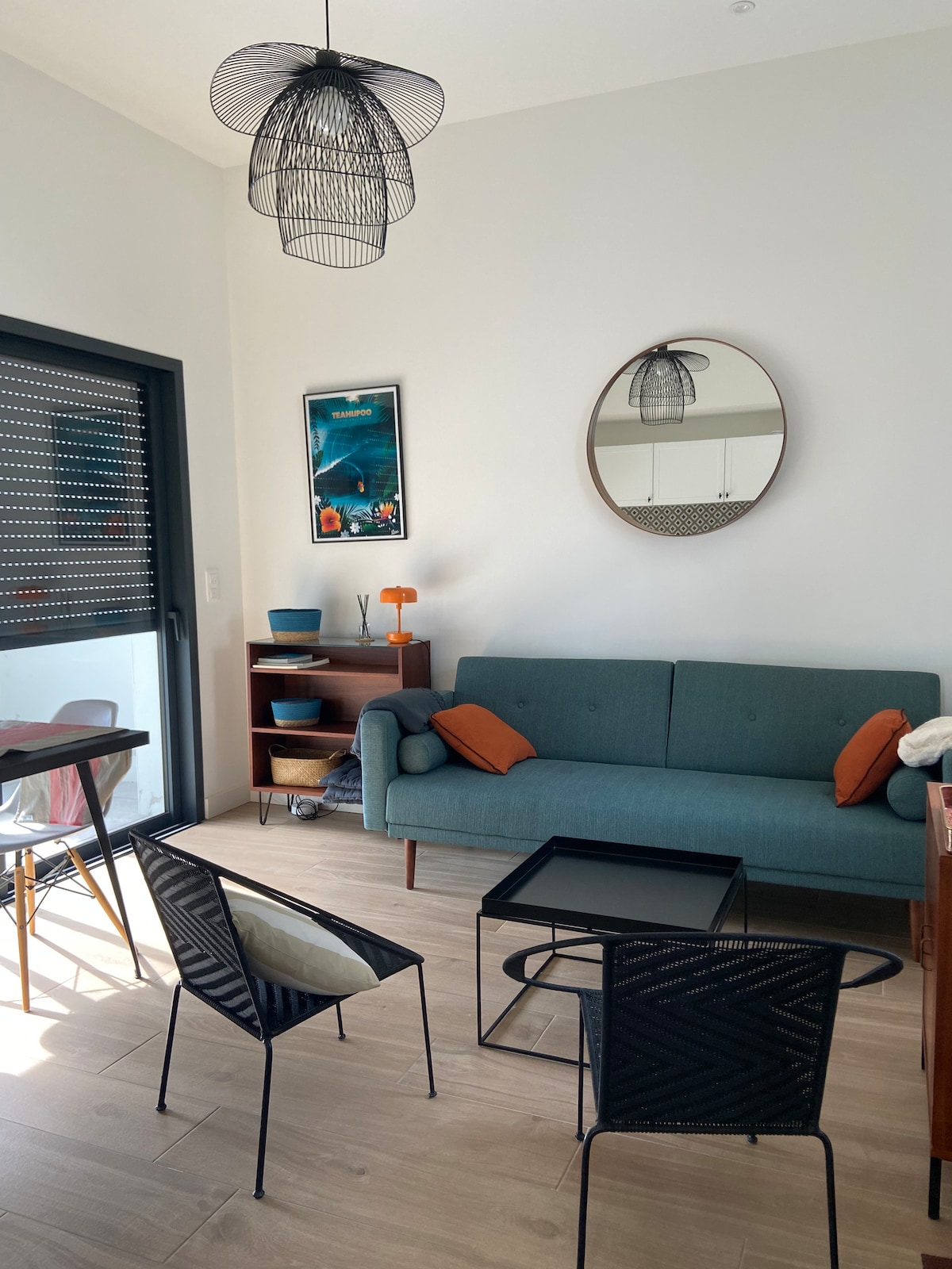 Como una casa, para disfrutar en familia o con amigos de este gran espacio de una sola planta: jardín cerrado, 3 dormitorios que se abren a la terraza, 2 baños, 2 aseos, gran salón, mesa de jardín, barbacoa y aparcamiento privado (muy apreciable). Barrio tranquilo, cerca a pie del mar, restaurantes; 6 personas se alojan cómodamente. Las tablas de surf, las boyas, las bicicletas... se podrán guardar. A pie de obra de las caminatas, España, el interior.