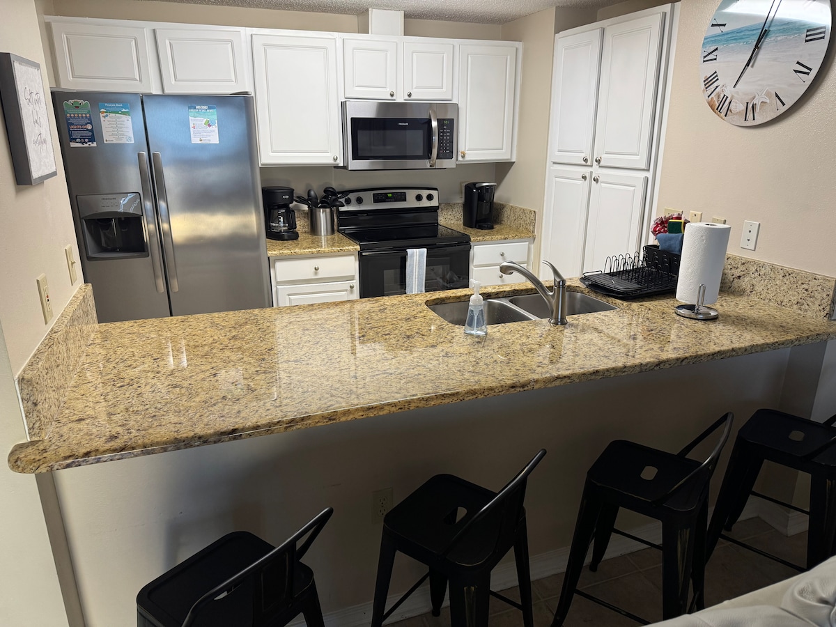 Bienvenido a un lugar al que querrás volver una y otra vez. ¡Recién reformado, con todas las comodidades! ¡A pocos pasos de un bar Tiki y de una enorme piscina/bañera de hidromasaje al aire libre! ¡Música en directo casi todas las noches! ¡Aparcamiento justo enfrente! Johnson y Orange Beach están a pocos minutos. ¡Nuestro objetivo es asegurarnos de que lo pases lo mejor posible! Te mereces un descanso. El sofá se convierte en una cama tamaño queen. Disfruta de cocina completa, ducha grande, gimnasio, piscina cubierta y al aire libre y, si crees que falta algo, ¡avísanos!