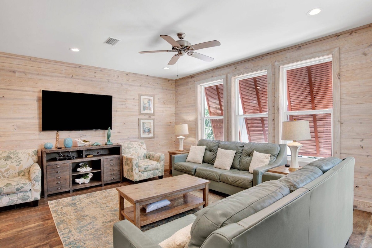 Impresionante casa costera que ofrece una elegancia relajada. Blue Crab es un alojamiento prémium con una decoración costera de alta gama y una cocina totalmente abastecida. ¡Camina fácilmente a restaurantes, tiendas y al Hangout! El acceso privado a la playa está justo al otro lado de la calle a través de un paso de peatones y un sendero. La playa está a solo 2 minutos a pie de la casa de campo. Disfruta de una noche de rejuvenecimiento con nuevos colchones de lujo en cada dormitorio. Todas las habitaciones tienen televisores inteligentes con acceso a miles de películas. ¡Se proporciona equipo de playa Tommy Bahama!