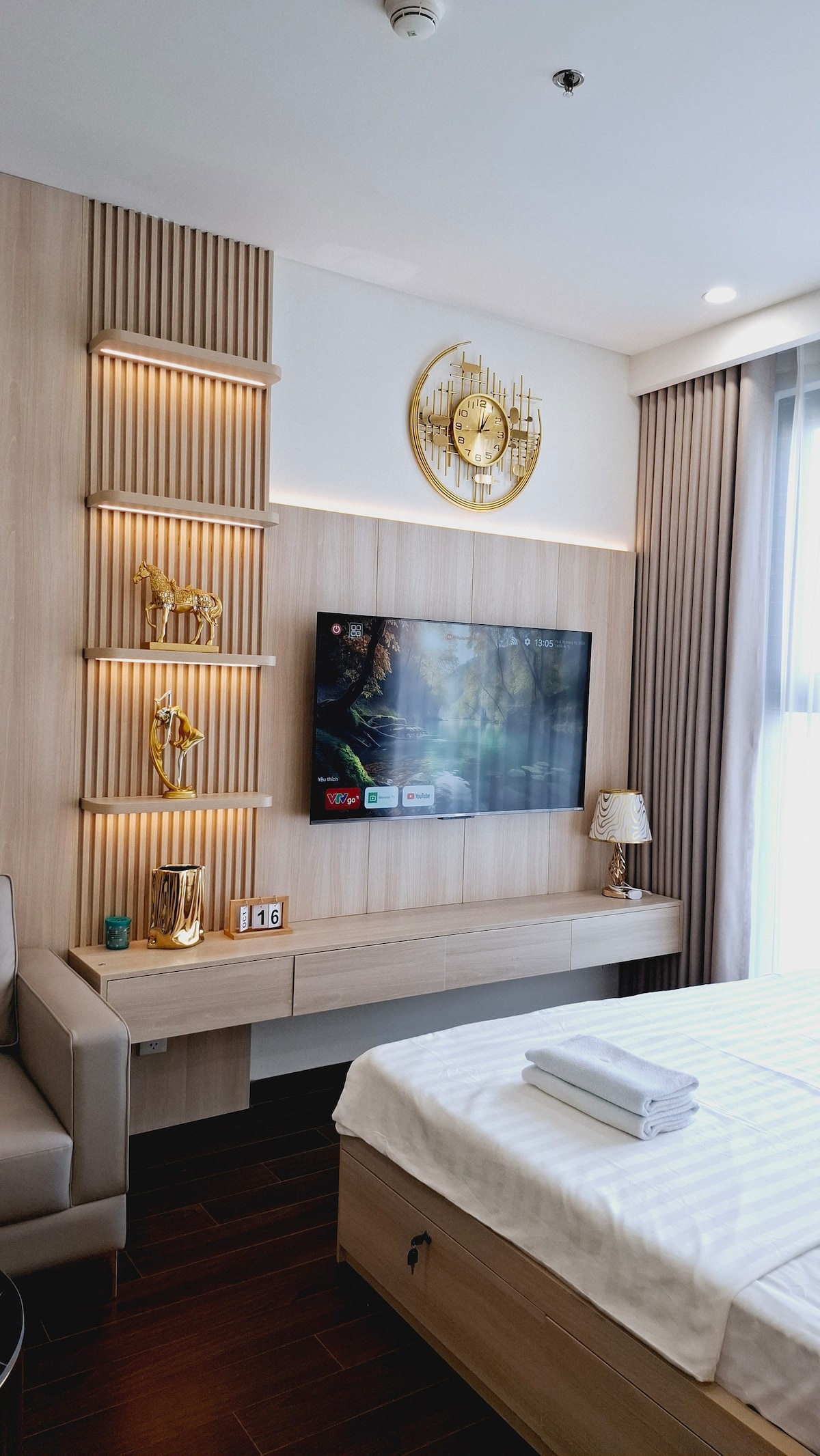 Căn hộ được thiết kế sang trọng, hiện đại với không gian mở ,tầm nhìn thơ mộng cả về hồ và thành phố lung linh.. Phòng bếp đầy đủ tiện nghi với các dụng cụ nấu ăn cơ bản, lò nướng tiện lợi, sẵn sàng cho những bữa ăn ngon miệng. Bạn có thể thư giãn với TV màn hình lớn có sẵn Netflix, hoặc thưởng thức ly rượu vang trong không gian ấm cúng của riêng mình. Đặc biệt, bạn còn được sử dụng miễn phí bể bơi và phòng gym hiện đại trong khuôn viên, giúp bạn luôn năng động và thư giãn trong suốt kỳ nghỉ.