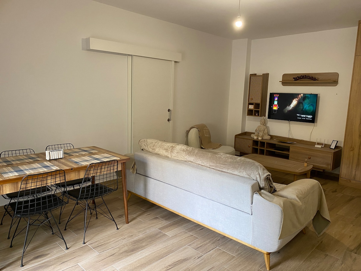 Ideal for those looking for a quiet and peaceful stay, this apartment provides a comfortable stay with 2 spacious rooms, a double bed in each room, and 2 bathrooms. You can spend a comfortable time in the spacious lounge area with a TV. In addition, the balcony of our apartment has a view of a green stream. Located in a quiet neighborhood, and very close to the center of gönyeli.