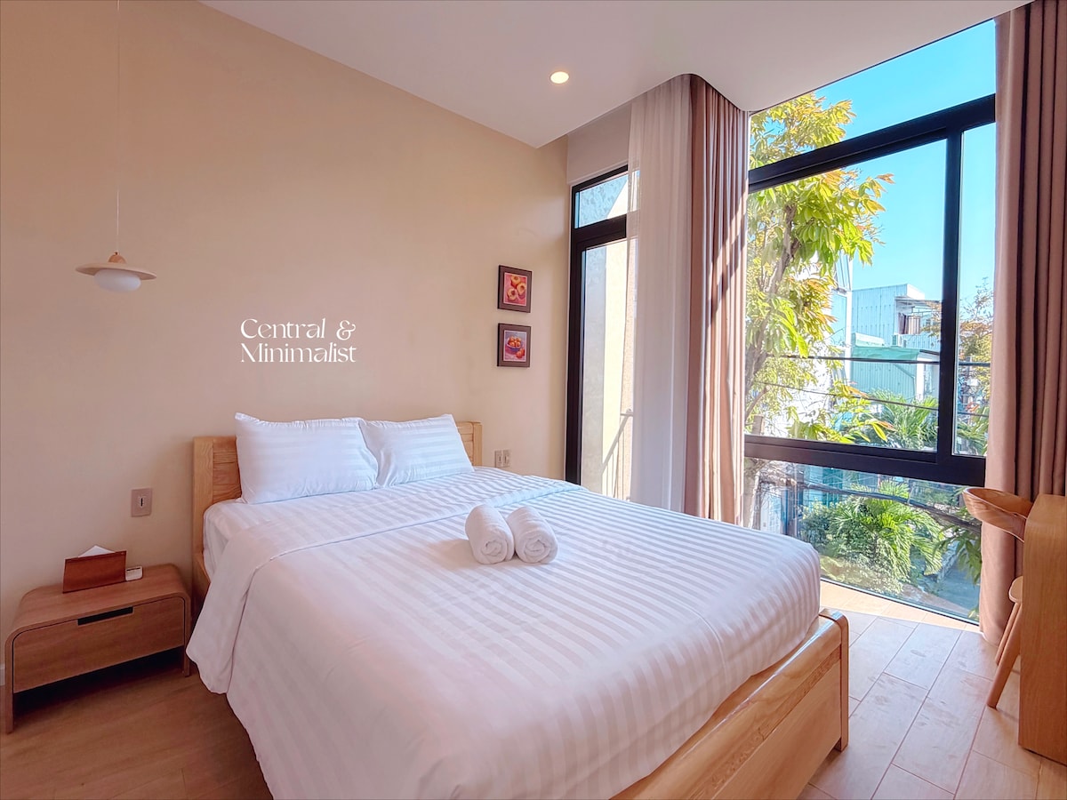 Es un apartamento de 55 metros cuadrados, 2 dormitorios y 1 baño diseñado en estilo Japandi, donde el minimalismo se encuentra con la elegancia. El espacio está totalmente equipado con muebles modernos para una estancia cómoda. Ubicado en la 1.ª planta (2.ª en EE. UU.) de Astro House, un edificio inspirado en Santorini lleno de vegetación en una zona tranquila. Ya sea tomando el sol o disfrutando de la brisa del océano, nuestra minipiscina en la azotea y la playa de My Khe (a solo un corto paseo) te esperan para que las explores.