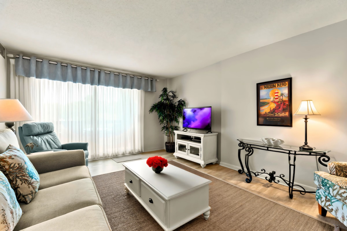 Tus vacaciones perfectas comienzan cuando sales por la puerta de este apartamento recién renovado en el puerto deportivo con sus tiendas boutique, restaurantes gourmet, club de raquetas que ofrece tenis y pickleball, el famoso campo de golf del torneo PGA y el icónico faro rojo y blanco. El espacioso dormitorio tiene capacidad para cuatro personas. El dormitorio principal tiene una cama tamaño king y un gran ventanal que viene con cortinas opacas para los que se duermen tarde.