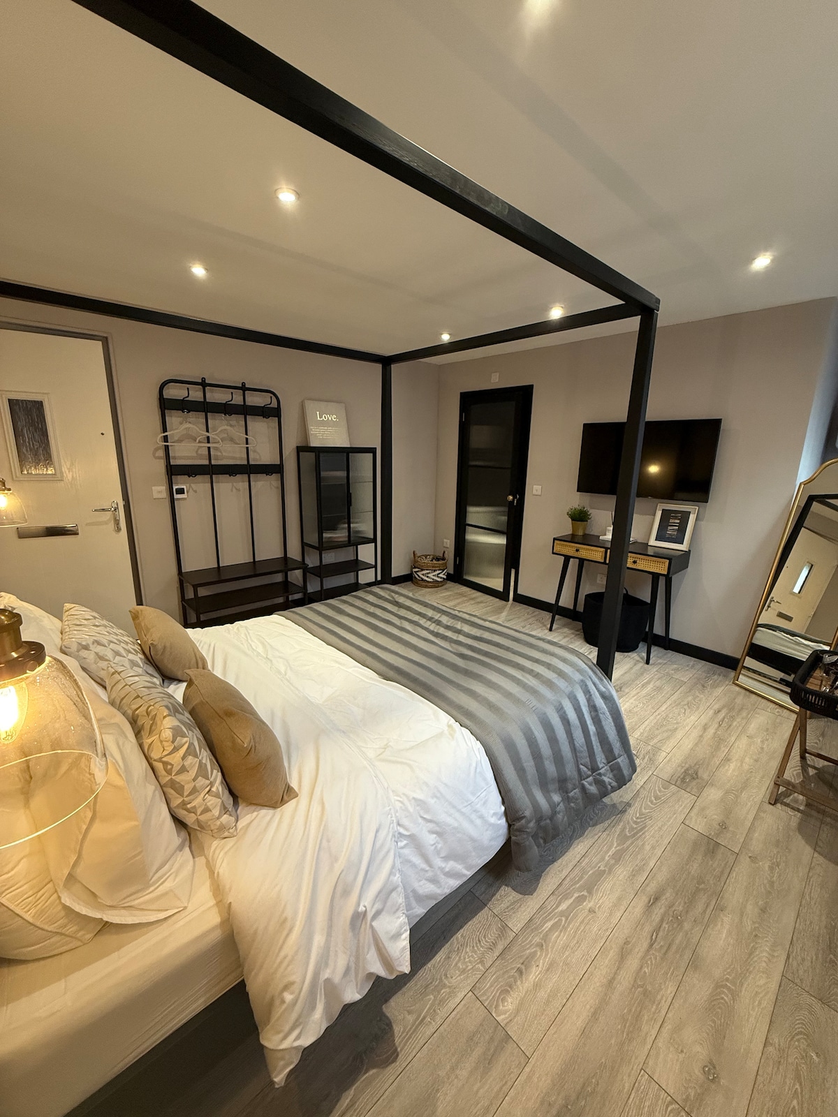 Un anexo recientemente creado al que se accede desde la entrada privada de nuestra casa contigua. El alojamiento incluye cama tamaño king, espacio para colgar la ropa, cajón pequeño, espejo, TV, baño grande con ducha, inodoro, lavabo y espejo. Utensilios para preparar té y café, incluyendo hervidor y nevera pequeña. Se proporcionan sábanas y toallas. Aparcamiento en la unidad, pubs cercanos que sirven comida, también una cafetería local (que sirve desayuno), un pequeño Sainsburys y Coop a poca distancia a pie. Cerca de Fleet, Farnborough, Farnham y M3/M4.