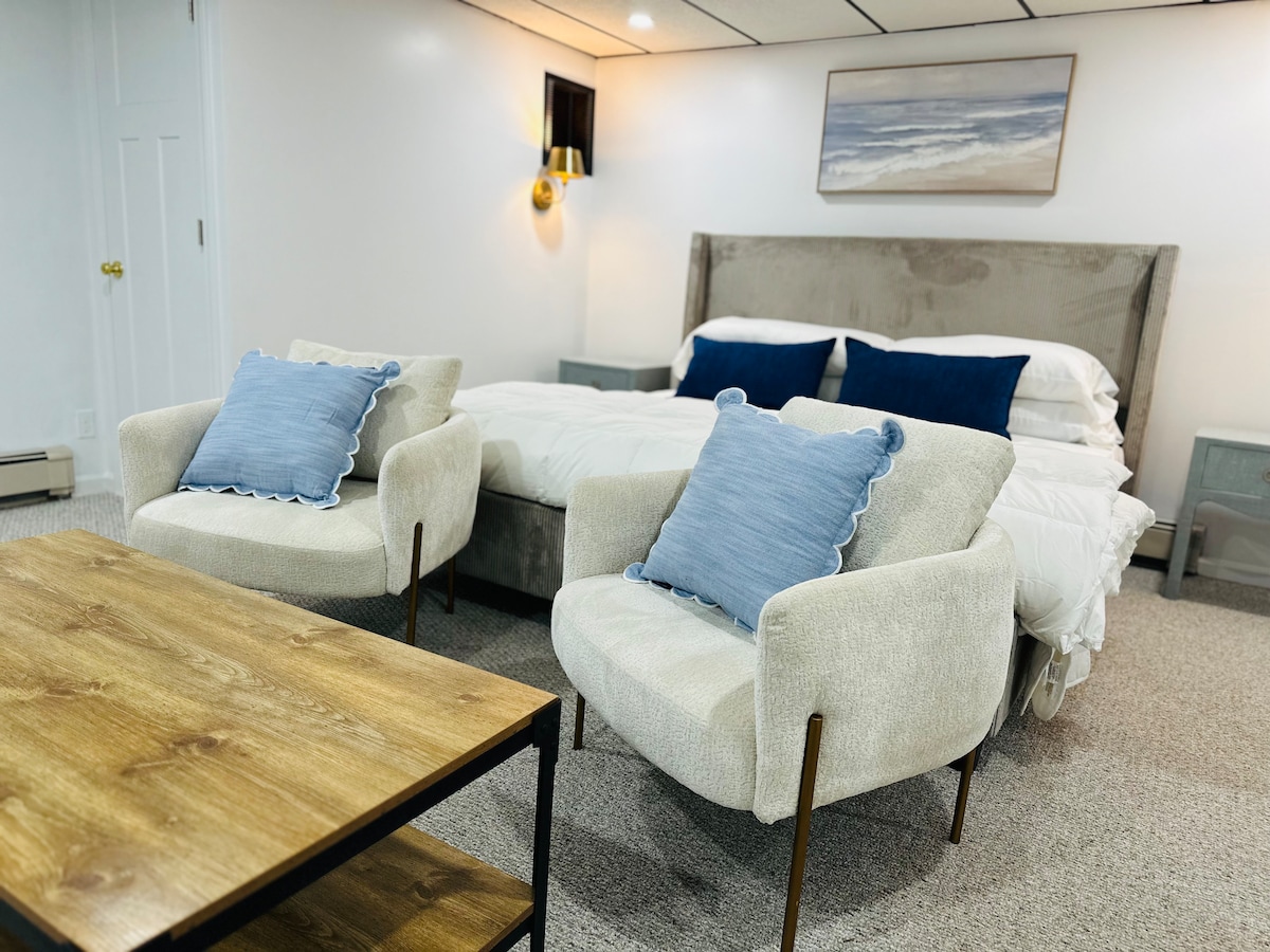 La suite estudio Get Away en Rock Farm, tranquila, segura, plano de planta de concepto abierto de 600 pies cuadrados con techos de 9 pies. Bosques tranquilos y aislados. Una cama tamaño king que los huéspedes adoran, añade una cama doble para adultos, 2 niños en el sofá cama. Cocina, comedor, sala de estar y baño. Elección de almohadas. Artículos diversos y comodidades. WIFI 500 Mbps, TV ROKU, patio de juegos, desayuno casero. Aparcamiento, tiendas, comestibles, lagos, a 13 minutos de UCONN, a 20 minutos de Hartford, senderos y parques. SOMOS 5 ⭐️ limpios con excelente hospitalidad. Ver The Hide Away 2 bdrm www.airbnb.com/h/atrockfarm