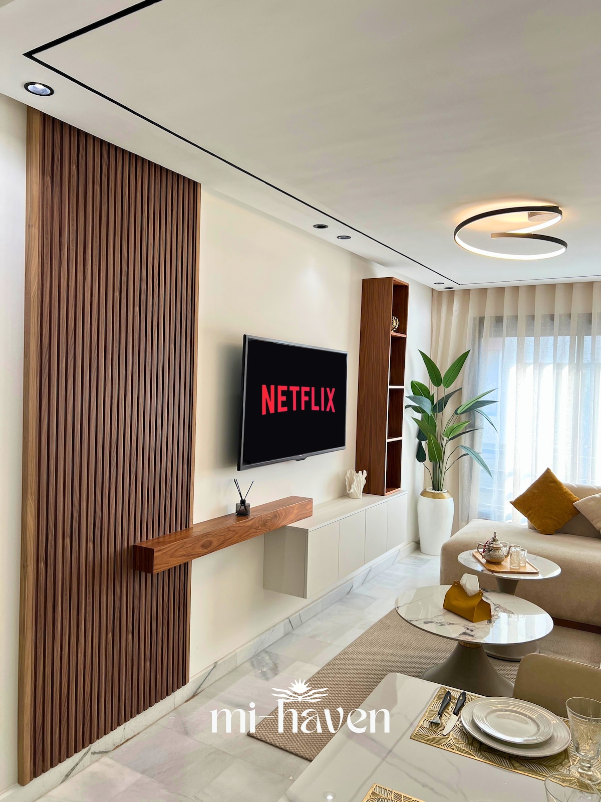 ¡Butterfly 703🦋, un remanso de paz donde la elegancia de una residencia moderna se combina con la comodidad de los hoteles de 5* en el corazón de Casablanca! Relájese en una amplia sala de estar de diseño moderno, equipada con Smart TV de 55’ con Netflix e IPTV para noches de relajación absoluta. La habitación, un verdadero nido acogedor, le promete noches tranquilas y reparadoras ☁️ ¡Desde su balcón privado, admire las espléndidas puestas de sol sobre la ciudad, haciendo que cada momento de su estadía sea inolvidable! ✨