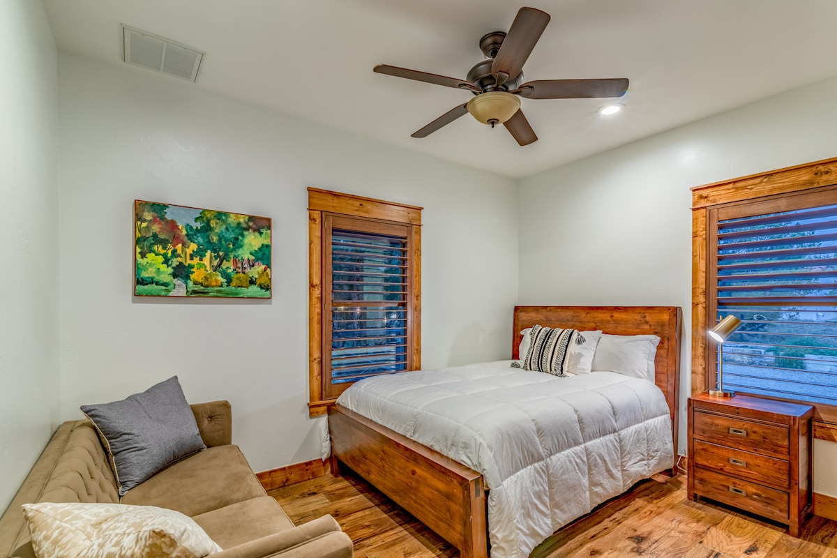 Disfruta de una gran escapada del ajetreo de la gran ciudad, pero lo suficientemente cerca como para disfrutar de todo lo que Austin tiene para ofrecer. Zilker Park y la calle 6 están a solo 30 minutos. El aeropuerto de Austin está a 15 minutos en coche. Nuestra casita de 2 dormitorios y 1 baño está totalmente equipada para alojar hasta 14 amigos y familiares con una cocina completa, baño completo, ducha de pie, chimenea interior, chimenea al aire libre, bañera de hidromasaje con privacidad máxima, parrilla, lavandería, juegos al aire libre, amplio estacionamiento y amplios senderos para explorar.