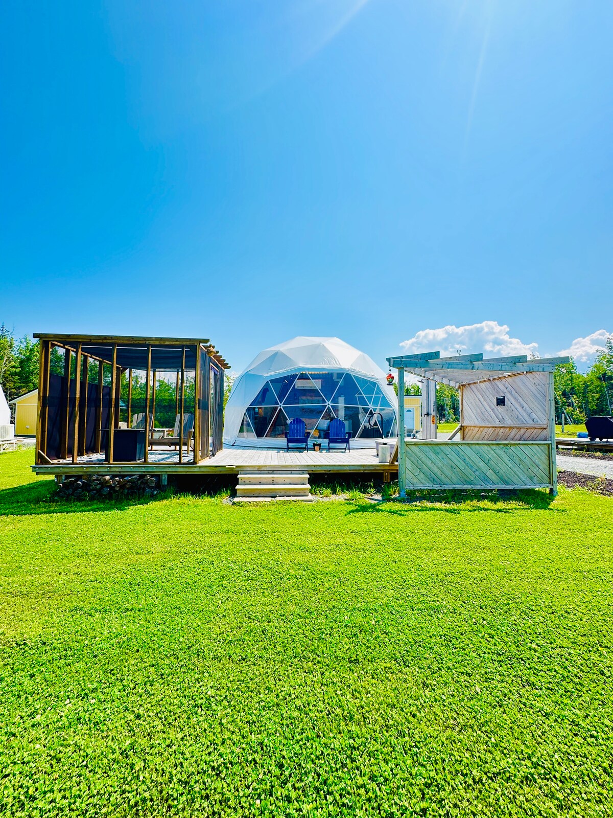 Cúpula frente al agua con vistas panorámicas, acogedor espacio habitable y cama queen loft. Cocina en la generosa cocina americana, relájate en el baño del spa, sumérgete en tu bañera de hidromasaje privada o relájate en el cenador con mesa de fuego. Rodeado de naturaleza, vida silvestre y total serenidad... ¡tu mejor refugio frente al mar solo para adultos!