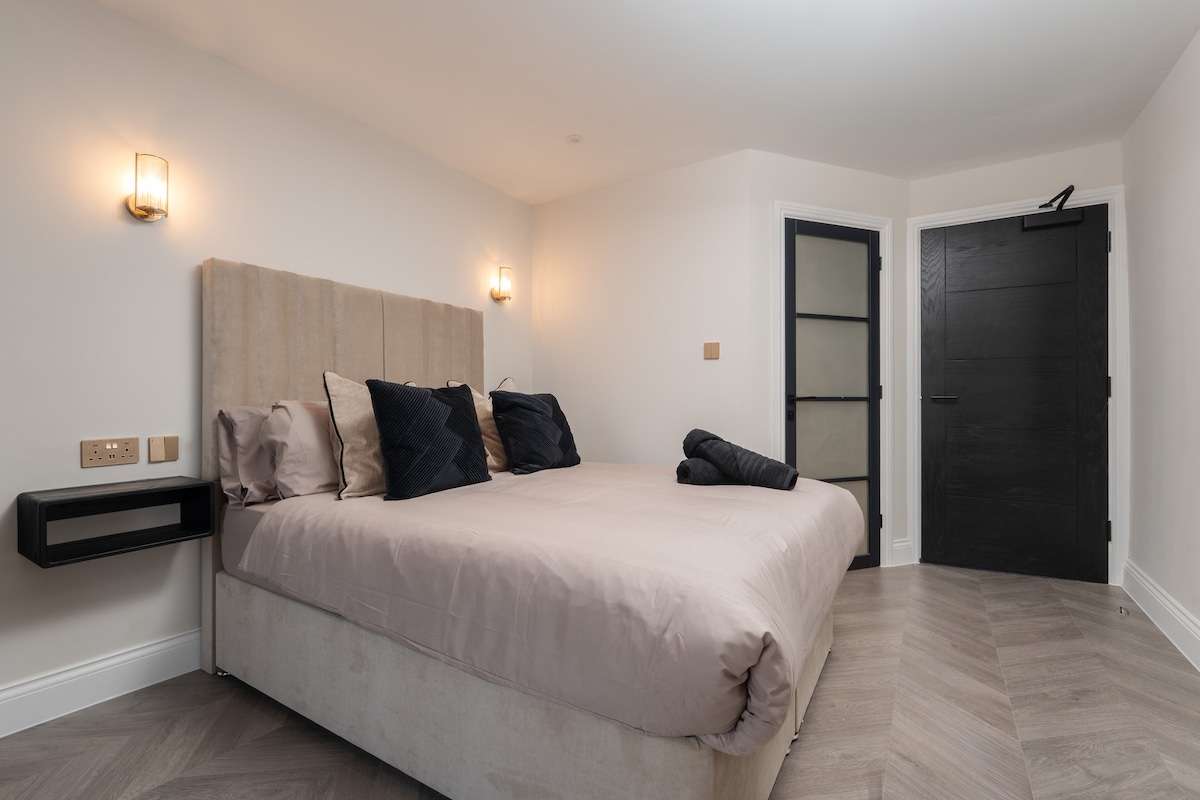 Una habitación estudio en el sótano recién reformada con ducha de efecto lluvia en suite y cocina moderna con placa de inducción doble, horno microondas y parrilla, nevera, lavavajillas compacto, hervidor de agua, tostadora y cafetera. La Smart TV de 43 pulgadas tiene Netflix y Amazon Alexa para todos tus requisitos de audio. También hay una zona de comedor/trabajo para dos. Ten en cuenta que esta habitación no tiene ventanas, pero la puerta está acristalada para permitir que entre luz natural en la habitación.