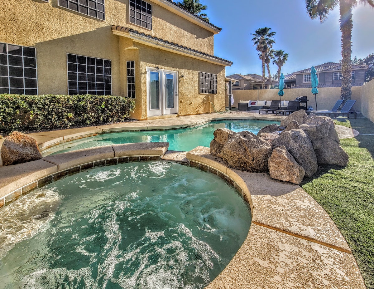 3 dormitorios (3 camas tamaño queen y 1 completo), 2 baños completos para que te relajes y disfrutes. Hermosa y relajante piscina climatizada (calefacción por una tarifa adicional) y spa, cocina equipada, la sala de estar tiene TV inteligente de 65 pulgadas. Esta casa está justo al final de la calle de Las Vegas Blvd y a poca distancia en auto de Las Vegas Strip, Allegiant Stadium, T-Mobile, el antiguo centro de la ciudad, el Parque Nacional Red Rock y Hoover Damn. El espacio exterior incluye cómodas sillones, una mesa al aire libre y una sala de estar debajo del patio cubierto. Consulta los detalles para obtener más información.