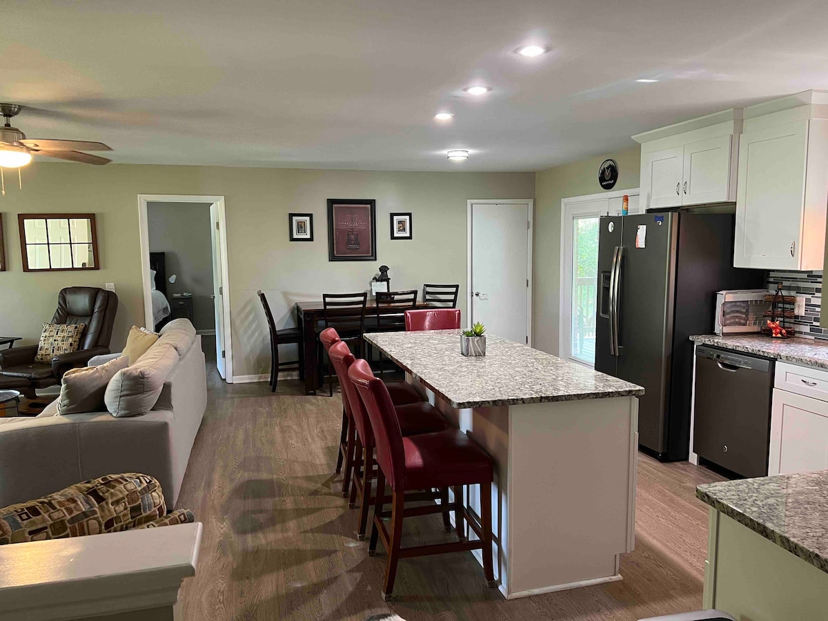 Ven a disfrutar de la zona de Nashville y relájate en nuestra tranquila suite de invitados. ¡Está cerca de la ciudad y a menos de 5 minutos del lago! ¡Disfruta de lo mejor de la vida urbana, la vida junto al lago y relájate alrededor de la fogata en un hermoso entorno rural! ¡Esta suite estudio tiene el encanto de Nashville! Está seccionada con paredes de ladrillo y tablillas, además de cortinas. Disfruta del café de la mañana en un patio cubierto privado mientras observas la vida silvestre y planificas tus aventuras. ¡Tenemos ciervos y pavos salvajes que nos visitan regularmente!
