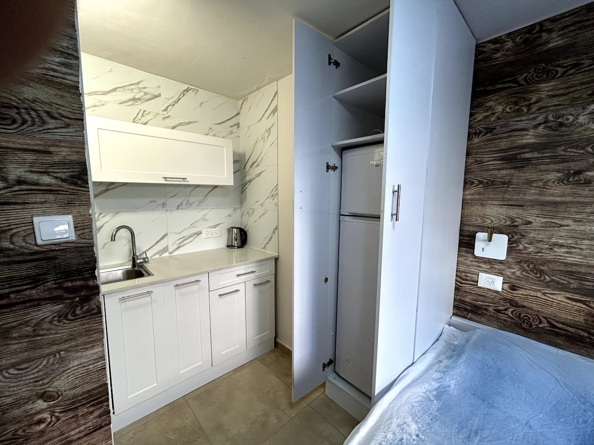 Un cómodo estudio soleado renovado con cama tamaño queen, aire acondicionado, aseo privado, ducha, cocina totalmente equipada, jardín en la azotea, estacionamiento gratuito, refugio comunitario en la planta baja, wifi rápido, desayuno gratuito bajo petición. Ubicación privilegiada. ¡A poca distancia a pie de Beit Protea, IDC, estación de autobuses! A 7 minutos en coche de la playa. Ropa de cama completa +toallas, suministro constante de agua caliente y agua potable, secador de pelo, cafetera espresso, esterilla de yoga. Si extrañas a tu querida mascota, nuestra perra Donna a tu servicio😀. Habla EN, HE, RU.