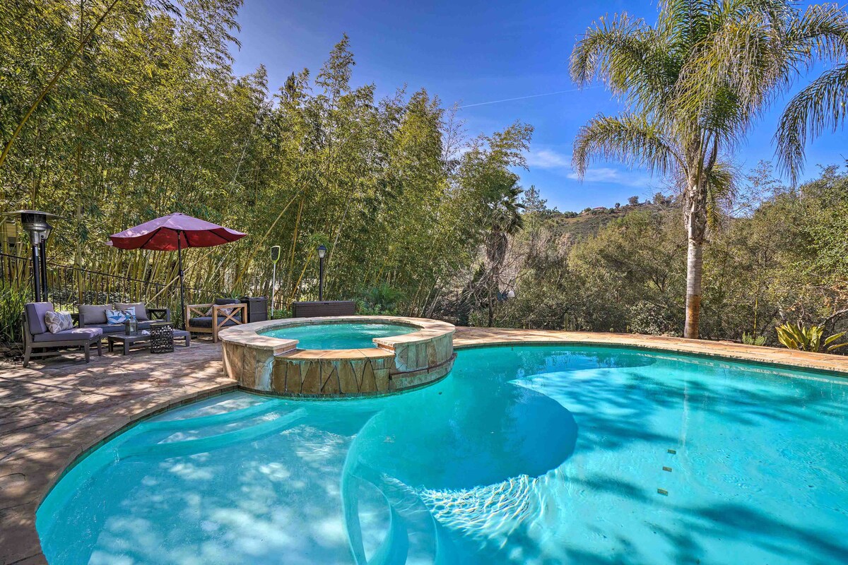 Casa privada totalmente cerrada con 3 dormitorios y 2,5 baños, y ofrece vistas increíbles. Date un baño en una piscina infinita de agua salada o sumérgete en el jacuzzi de agua salada. Saca provecho de los 8 árboles frutales diferentes en el sitio o relájate junto a la chimenea al aire libre. Muchas plazas de aparcamiento. Mesa de tejo para entretenerse con juegos. A poca distancia a pie de The Welk Resort, que ofrece 8 piscinas, 2 campos de golf, un spa y restaurantes. Atracciones cercanas al San Diego Zoo Safari Park y las bodegas de Temecula.